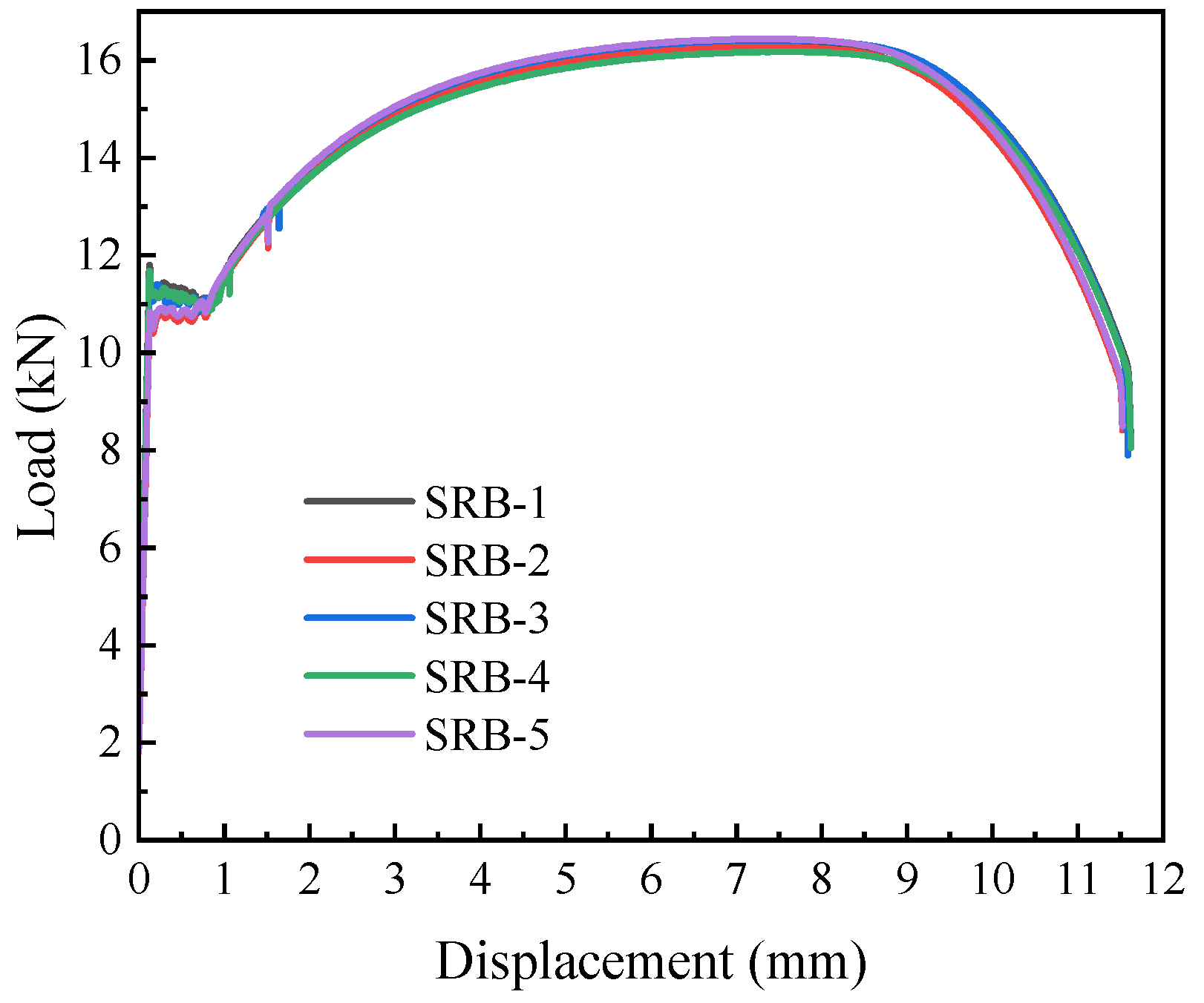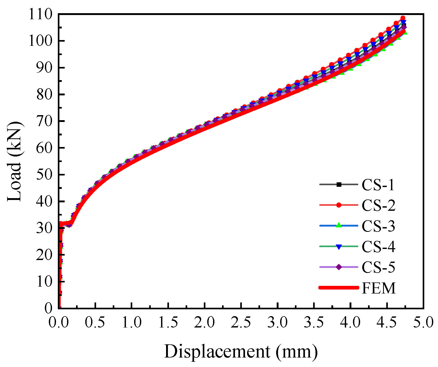 Figure 6, the load–displacement curves of L360QS steel display a noticeable yield plateau, and the close agreement among specimens demonstrates the dependability of the results.