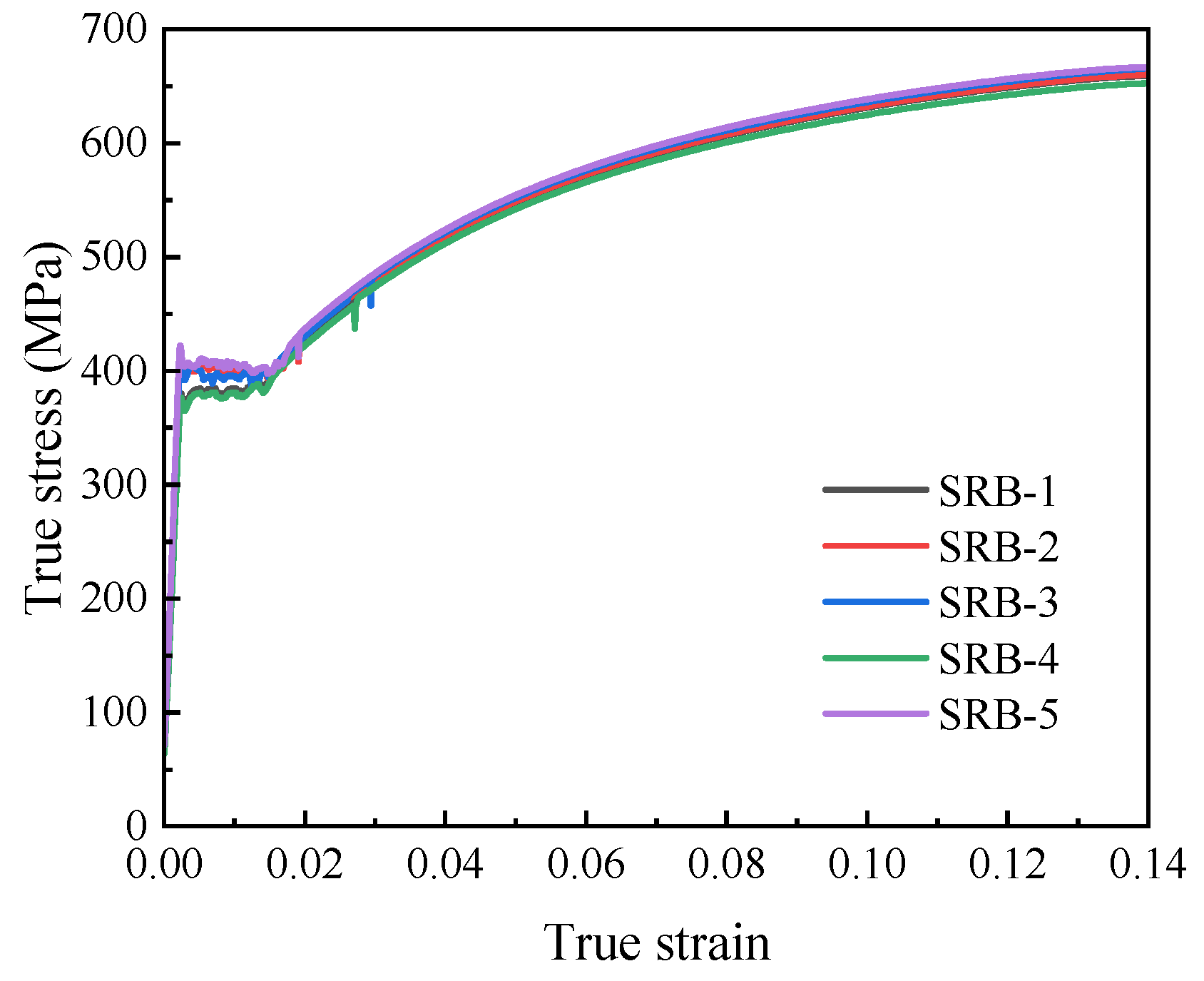 Traditional engineering stress is based on the initial geometry. Once the material enters plastic deformation, due to cross-sectional contraction, the engineering stress will severely underestimate the true stress actually borne by the material. This deviation causes the engineering stress–strain curve to display a descending segment after reaching the tensile strength, which is not true material softening but a geometric effect caused by necking (plastic instability). If this curve were used to construct a constitutive model, it would lead to misjudgment of the material’s plastic hardening characteristics. Therefore, this study uses a true stress–true strain framework. Assuming constant volume during the pre-necking plastic deformation, conversion is performed via Formulas (1)and (2) [
