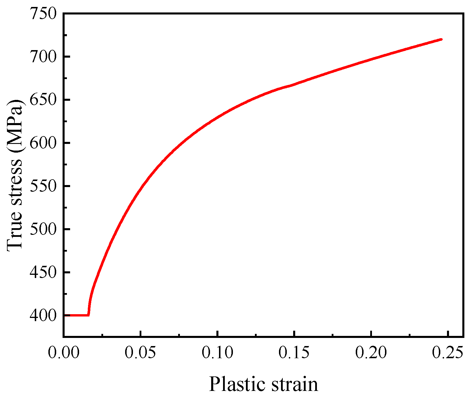 Figure 7, the true stress–strain curve of L360QS steel before necking was obtained based on the displacement–load response. The mechanical parameters averaged from five repetitions are provided in