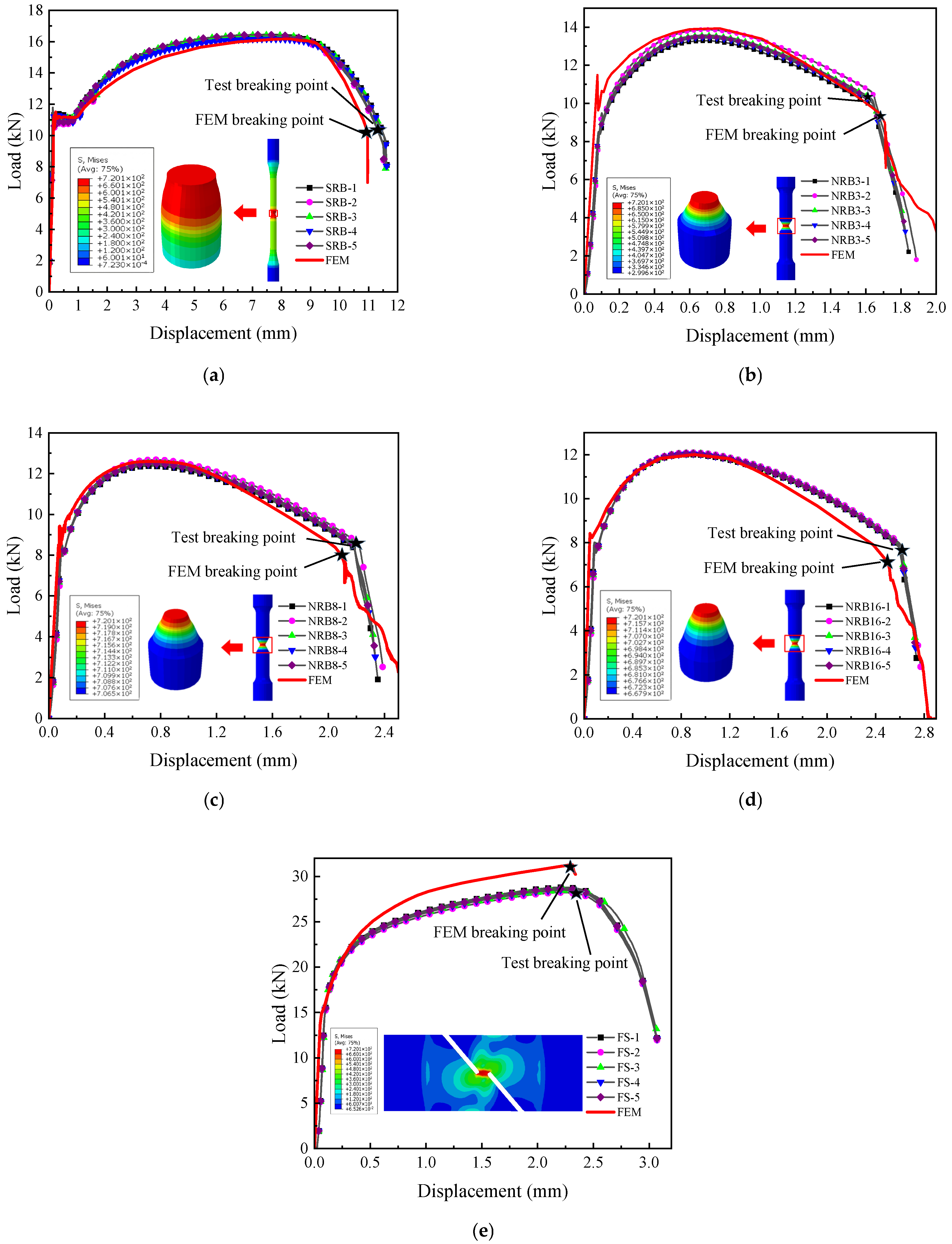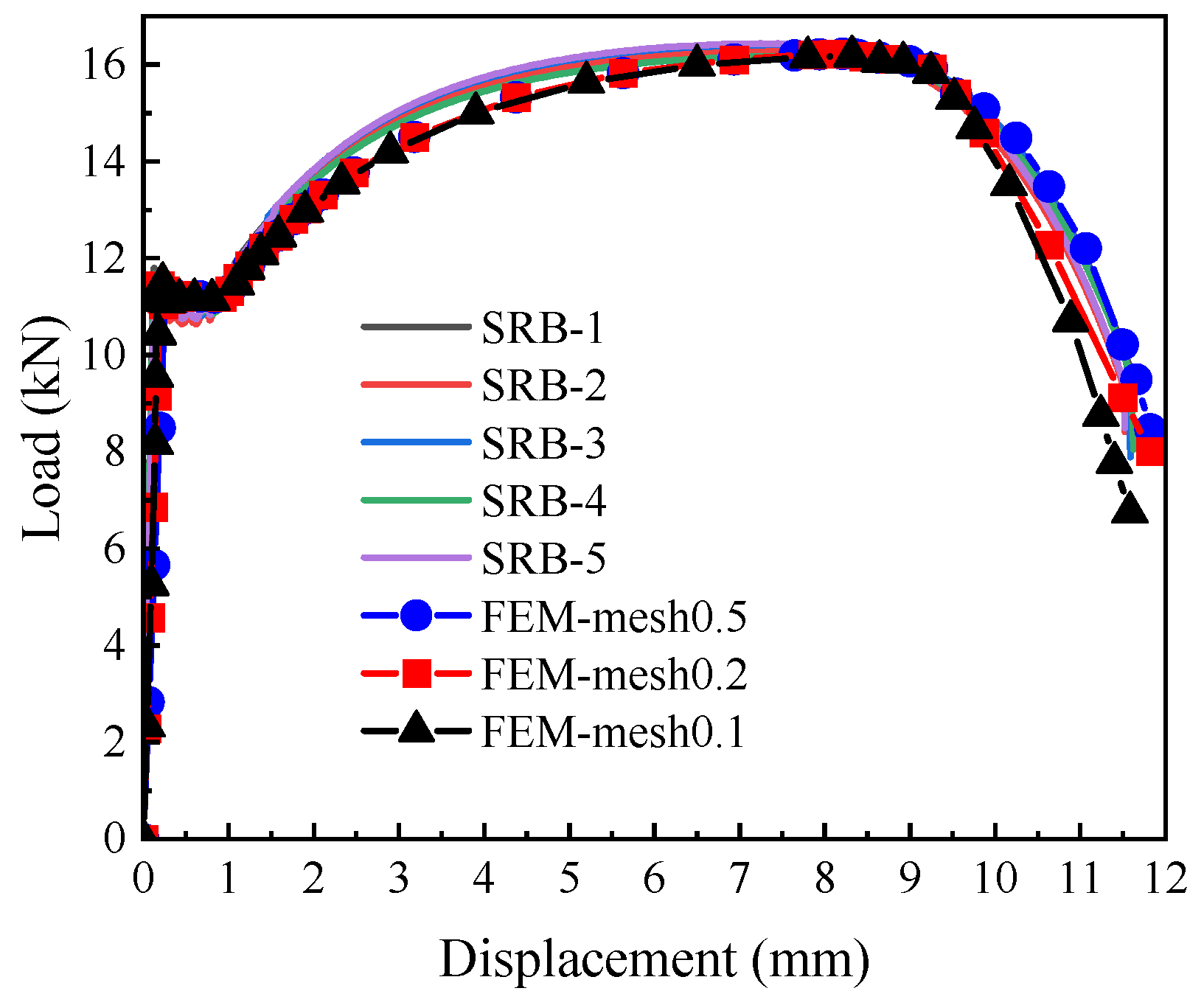 Because all material properties were assigned only elastic–plastic behavior, the models did not exhibit fracture during the simulation. The average experimental fracture displacement was taken as the onset of cracking, and this parameter was used to align the FEM predictions with the measured load–displacement curves.