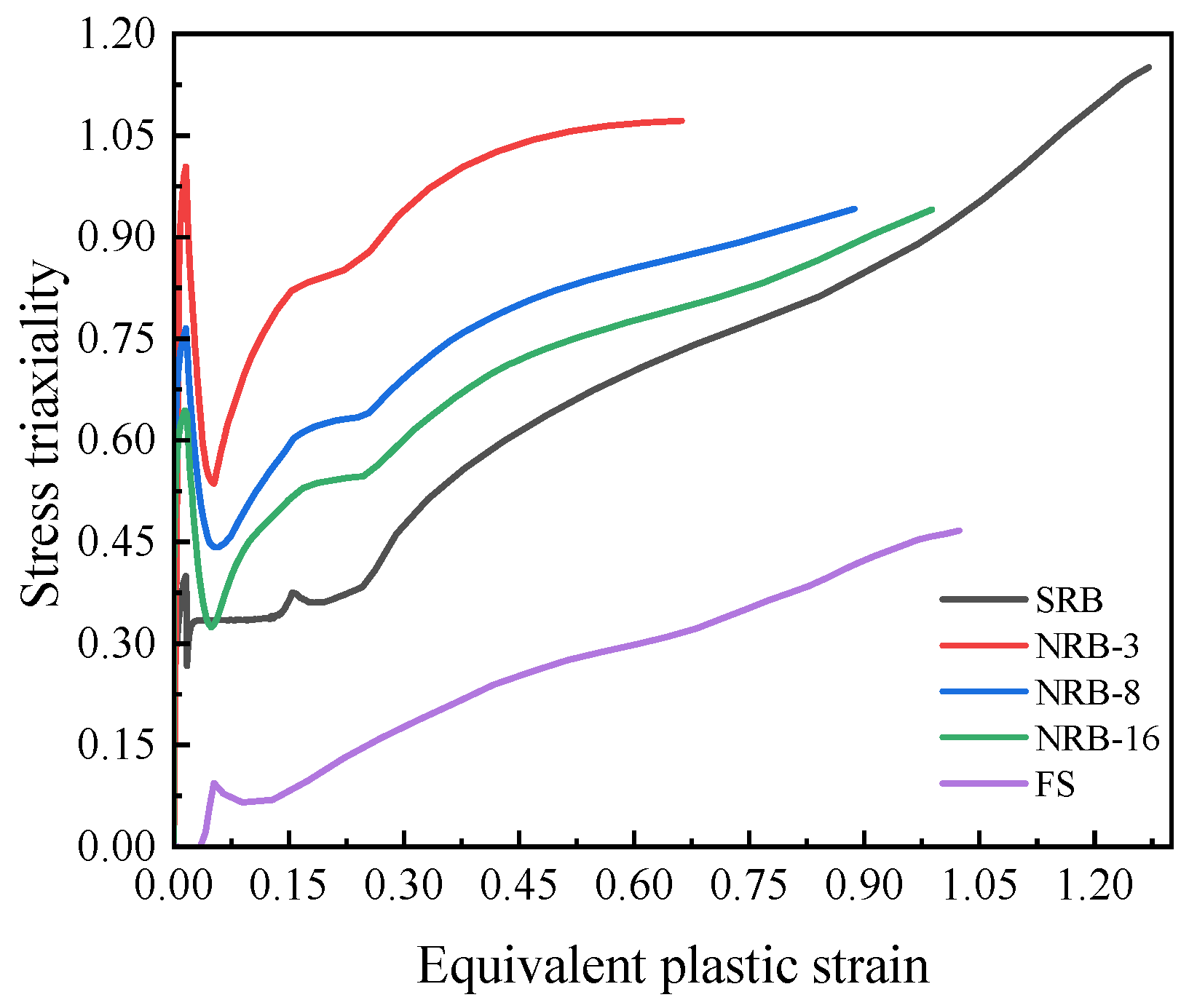 To extract fracture parameters, the complete deformation history of the critical element (i.e., the first element to fail in the model) needs to be obtained from the FEM simulation; this element is the crack initiation point, the first in the entire specimen to reach the fracture criterion. Therefore, the fracture strain refers to the equivalent plastic strain accumulated in this critical element when the applied displacement reaches the experimental fracture point. Using the full deformation history, the variation in stress triaxiality with equivalent plastic strain was determined and is presented in