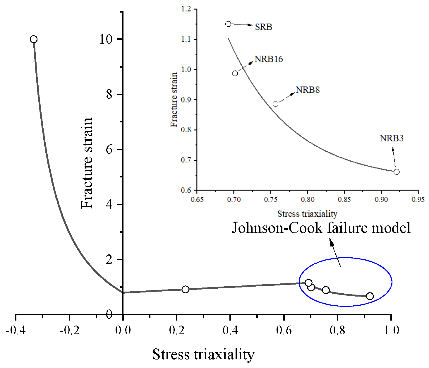 = 0.692~0.921, fracture strain decreases with increasing stress triaxiality, exhibiting a curving downward trend consistent with the exponential function distribution of the Johnson–Cook failure model.