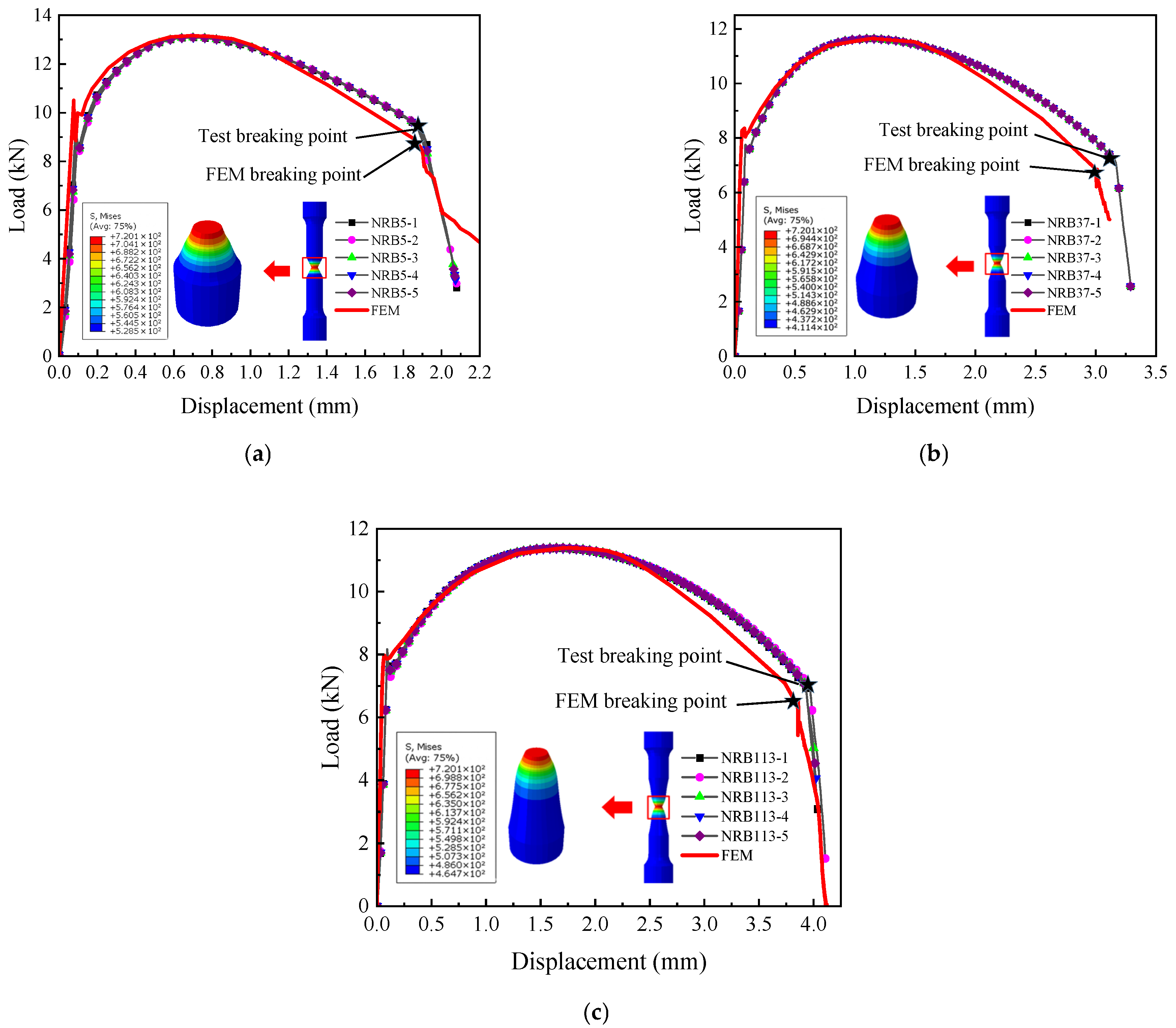 44]. The training set was used to fit the failure model and determine the parameters (through optimization algorithms); then, the test set was used to evaluate the model’s accuracy by calculating error metrics, thereby verifying the model’s generalization ability. Parameters were calibrated using the Levenberg–Marquardt non-linear least squares optimization algorithm to minimize the residual sum of squares between the model predictions and experimental data. In this study, NRB3, NRB8, NRB16, SRB, and FS specimens were used as the training set, and NRB5, NRB37, and NRB113 specimens were used as the test set.