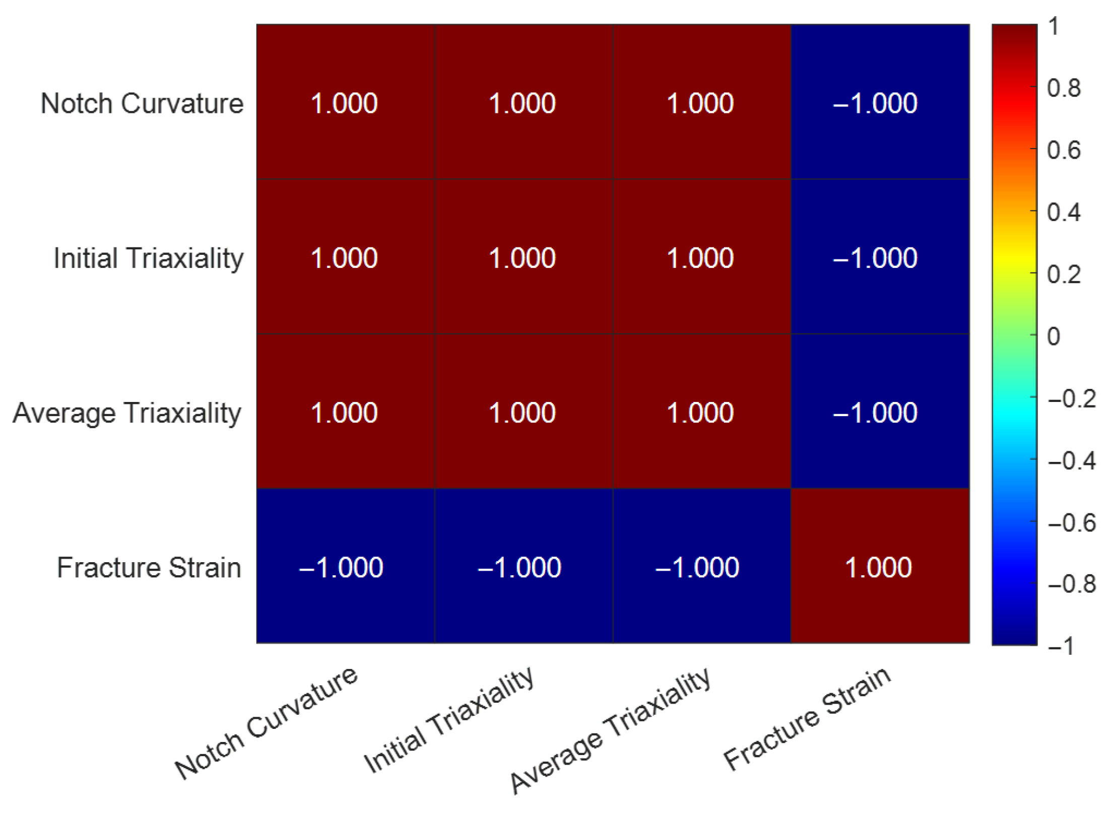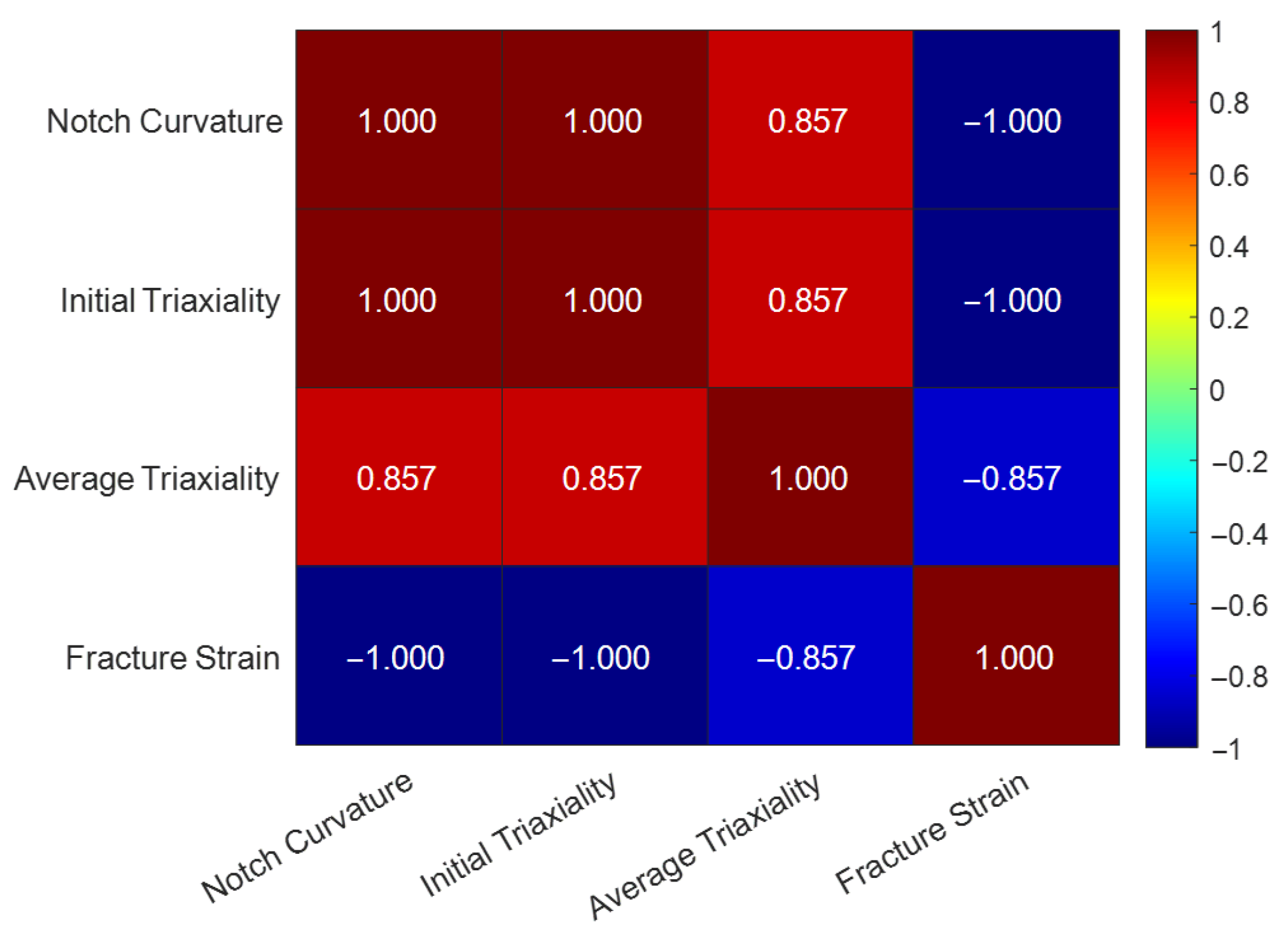 Notch Constraint Effects: Spearman correlation analysis quantitatively confirmed the strongly monotonic relationships between specimen geometry, stress state, and fracture behavior in the high stress triaxiality (tension-dominated) range.