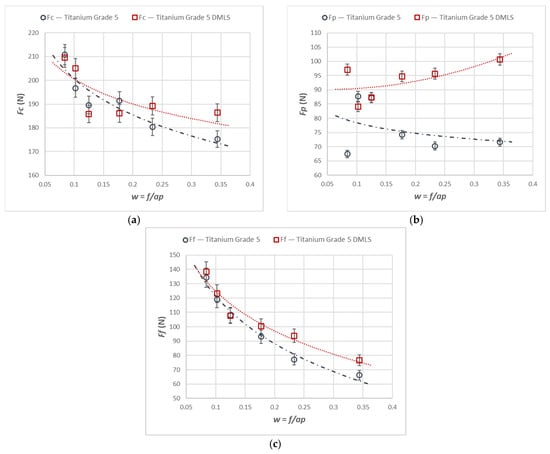 Figure 2 shows the variation in the total cutting forces Fc, Ff, and Fp as a function of the constant cross-sectional area of the removed layer, AD = 0.08 mm2, during turning of the cast and laser-printed Ti6Al4V alloy.