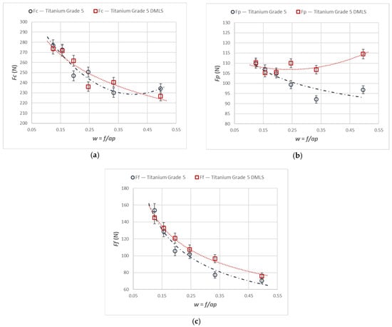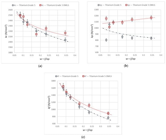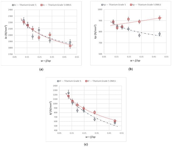 Similar trends to those observed for the force components were found for the corresponding specific cutting forces. Figure 3 presents the variations in the specific cutting forces kc, kf, and kp corresponding to the components Fc, Ff, and Fp for the turning of the printed and cast Ti6Al4V titanium alloy.