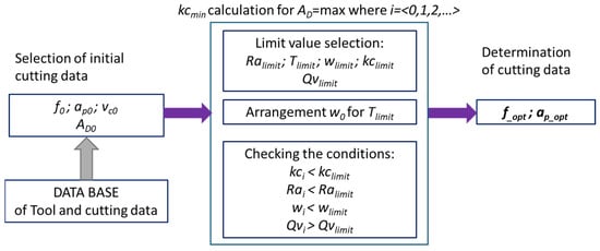 The algorithm presented in Figure 7 illustrates the procedure for selecting cutting parameters in such a way as to achieve the minimum specific cutting force (kc) while maintaining the required technological, quality, and operational constraints. This process involves the iterative selection of cutting conditions and their verification against established limit values.