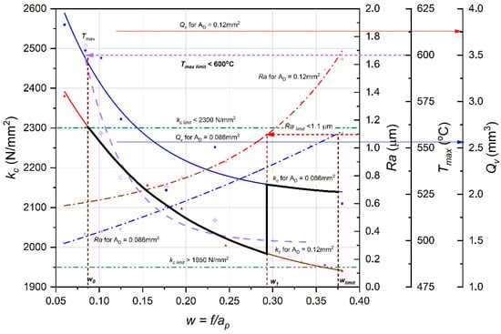 Figure 8 illustrates the operation of the specific cutting force minimization algorithm (kc) using sample experimental data. The dependencies are shown as a function of the parameter w = f/ap, which represents the feed-to-depth-of-cut ratio. Changing this ratio directly influences the cutting force, temperature, surface roughness, and volumetric efficiency. Two cross-sectional areas of the removed layer were analyzed: AD = 0.086 mm2 and AD = 0.12 mm2.