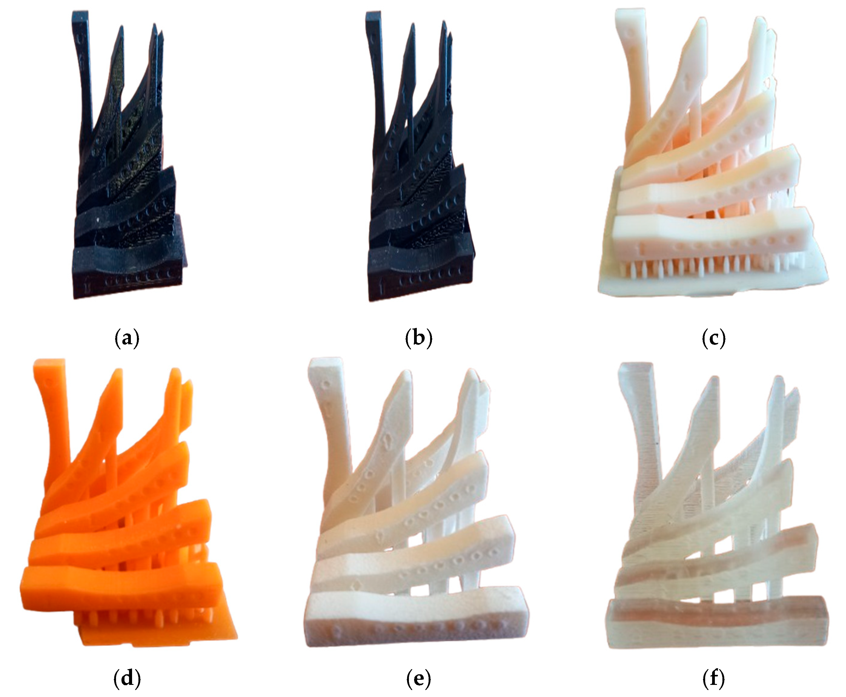 Considering the rheological aspect, in the case of the mSLA method, the low viscosity of the liquid resin allows for optimal self-leveling during the coating process, minimizing irregularities. The absence of a significant thermal process eliminates thermal deformation. Roughness is defined solely by the XY resolution and the internal photopolymerization effect, leading to the lowest 6.72–8.54 µm. Achieving an Sa parameter value in the range of 6.72 µm to 8.54 µm also has significant functional importance. Considering adhesion and bonding, the results obtained in the article fall within the roughness range 5–15 µm This range is often optimal for many standard adhesives as it increases the effective surface area for bonding. Consequently, mSLA components may eliminate the need for intensive surface preparation before gluing. Regarding sealing and assembly fit, the results obtained for samples fabricated using the mSLA method are much closer to the requirements for clearance fits and precise assembly, where mounting tolerances often require Sa < 5 µm. In the case of friction and wear, despite the relatively low values, mSLA surfaces still require post-processing (polishing or grinding) for critical tribological applications (e.g., bearings), where a roughness on the order of Sa < 1 µm is required. Considering the results obtained, the mSLA method provides the best surface quality immediately after 3D printing. Objects made using the mSLA method minimize the need for further finishing in applications where smoothness is critical. However, if surface treatment is necessary, it is limited to light polishing or grinding to achieve optical smoothness. The costs and processing time are the lowest among all other methods.