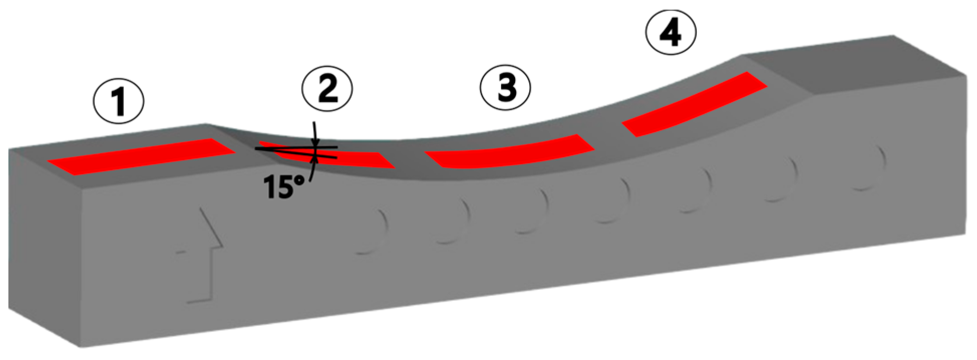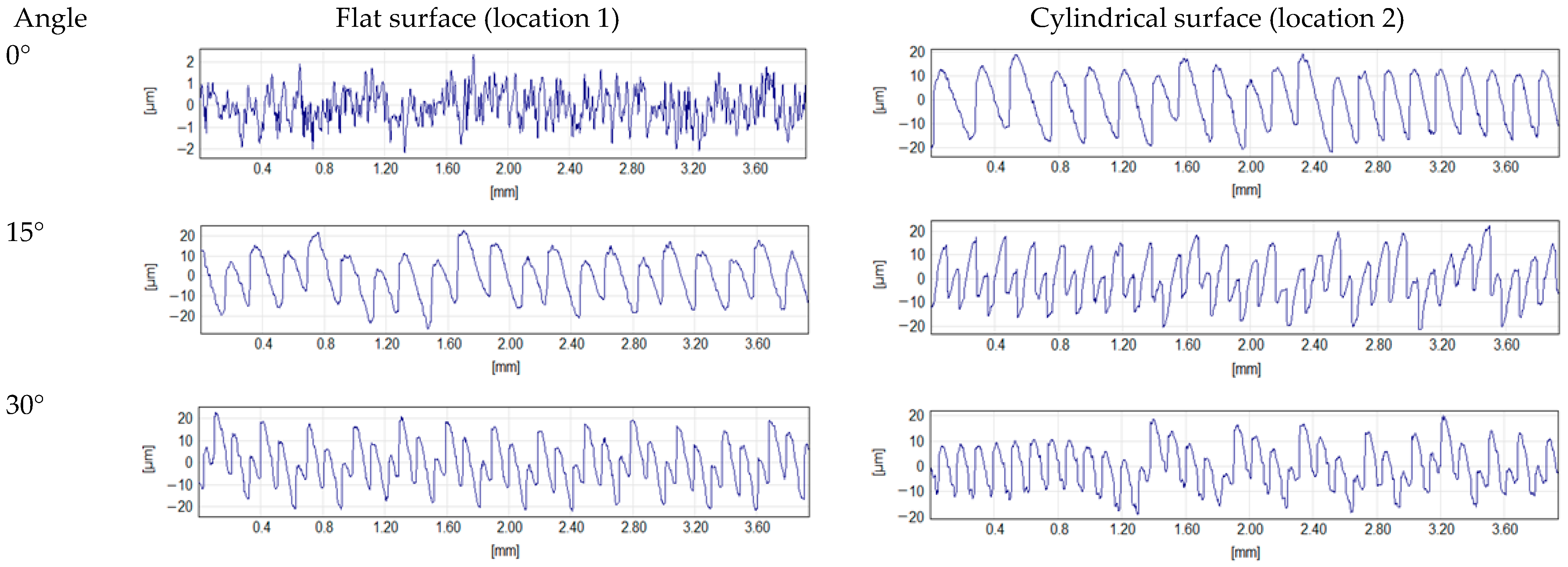 Figure 3). The angle between surface in location 1 and the tangent to surfaces 2 and 4, determined at the center of the measurement area, was 15°. For each sample type, a total of 28 surfaces were measured—corresponding to seven inclination angles (0–90°) and four measurement locations per angle. A 10× objective lens was used during the measurements, and the pixel size was 0.88 µm × 0.88 µm. Each time, an area of approximately 1 mm × 4 mm was measured. The measurements were performed using white light. The measurement data were processed in the SPIP 6.4.2 software, and surface topography parameters were determined. Statistical analyses were performed using Python 3.13 programming libraries. In all tests, the significance level was set at 0.05. To account for multiple comparisons, Bonferroni correction was applied within each set of analyses for a given sample type or surface texture parameter. This correction is commonly used in the literature when the number of comparisons is relatively small, as it provides a simple and conservative way to control the family-wise error rate and reduce the risk of false positives. The significance level, corrected using the Bonferroni method, was denoted as αB.