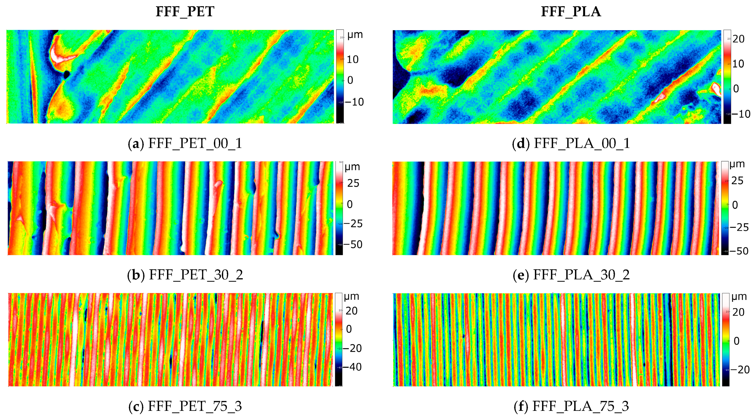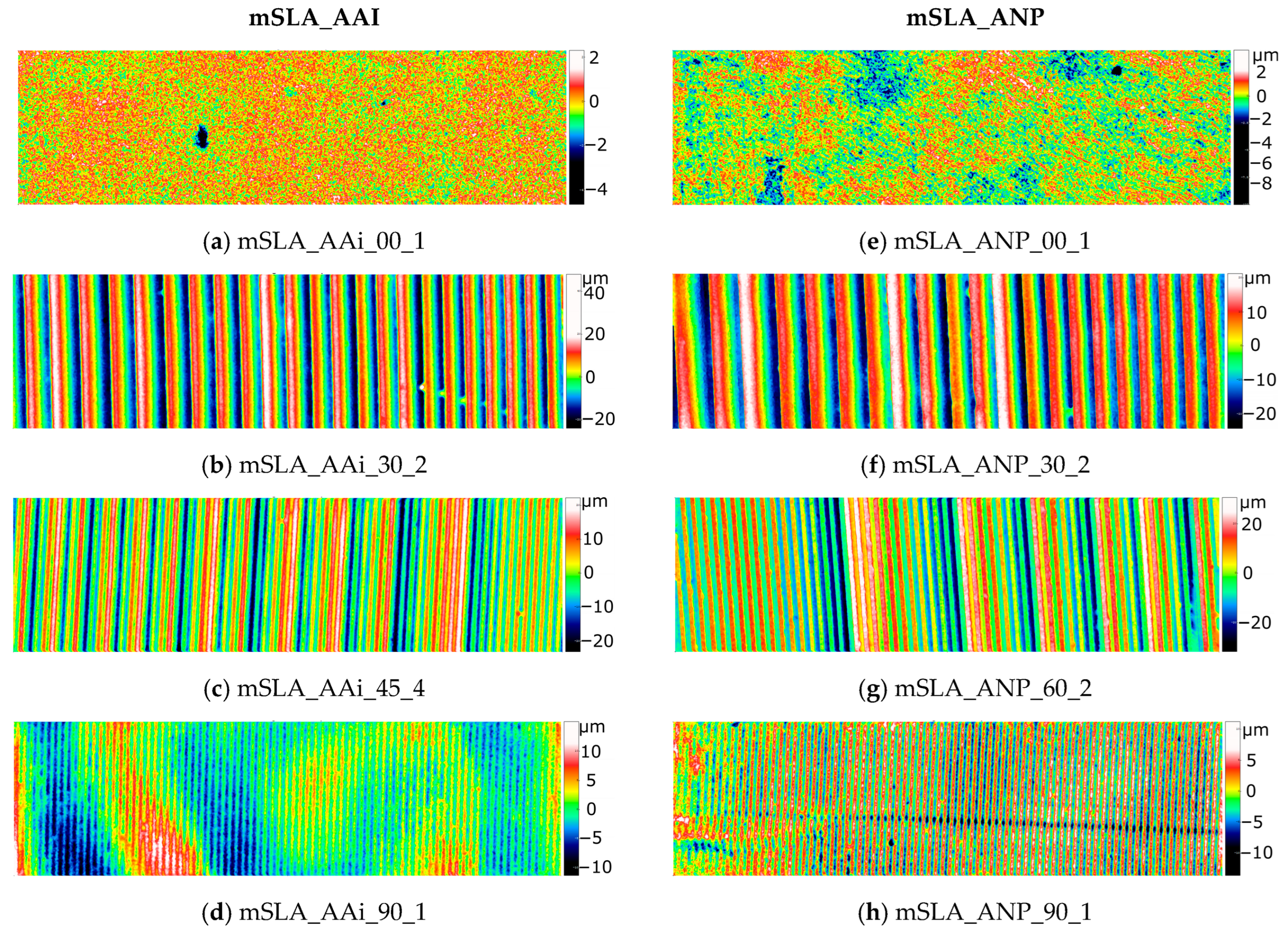 Figure 5c,d,f,g). A notable exception were the surfaces printed at a 15° angle relative to the printer’s XY plane. In these cases, a single peak typically consists of three layers, the boundaries between which are not visible on the maps (