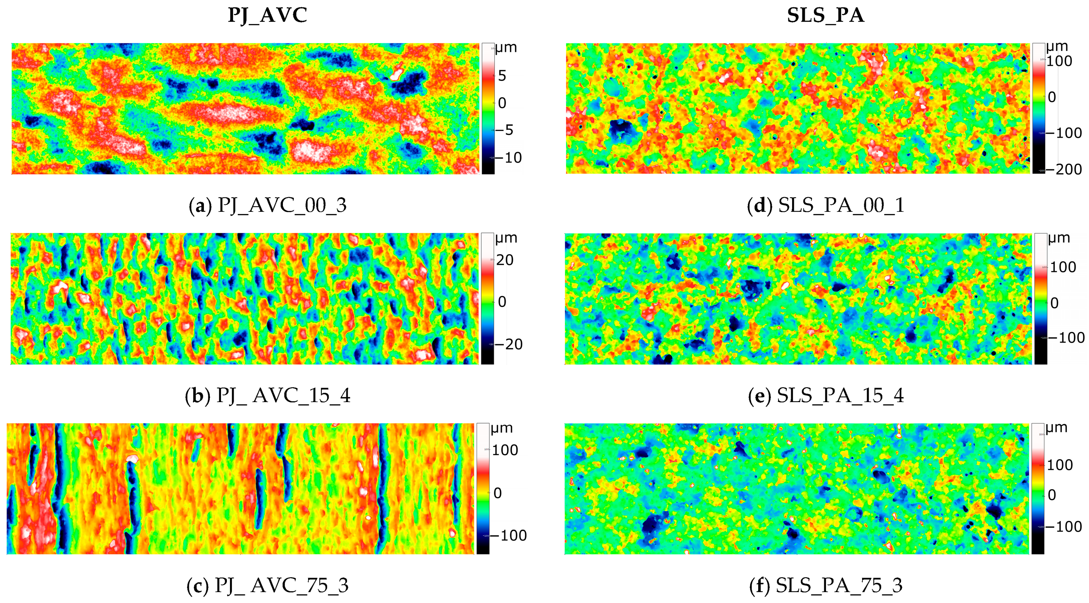 For all types of samples, except for those produced using the SLS method, it was observed that the topography of the flat surface corresponding to the final printed layer (samples labeled 00_1, images (a) in