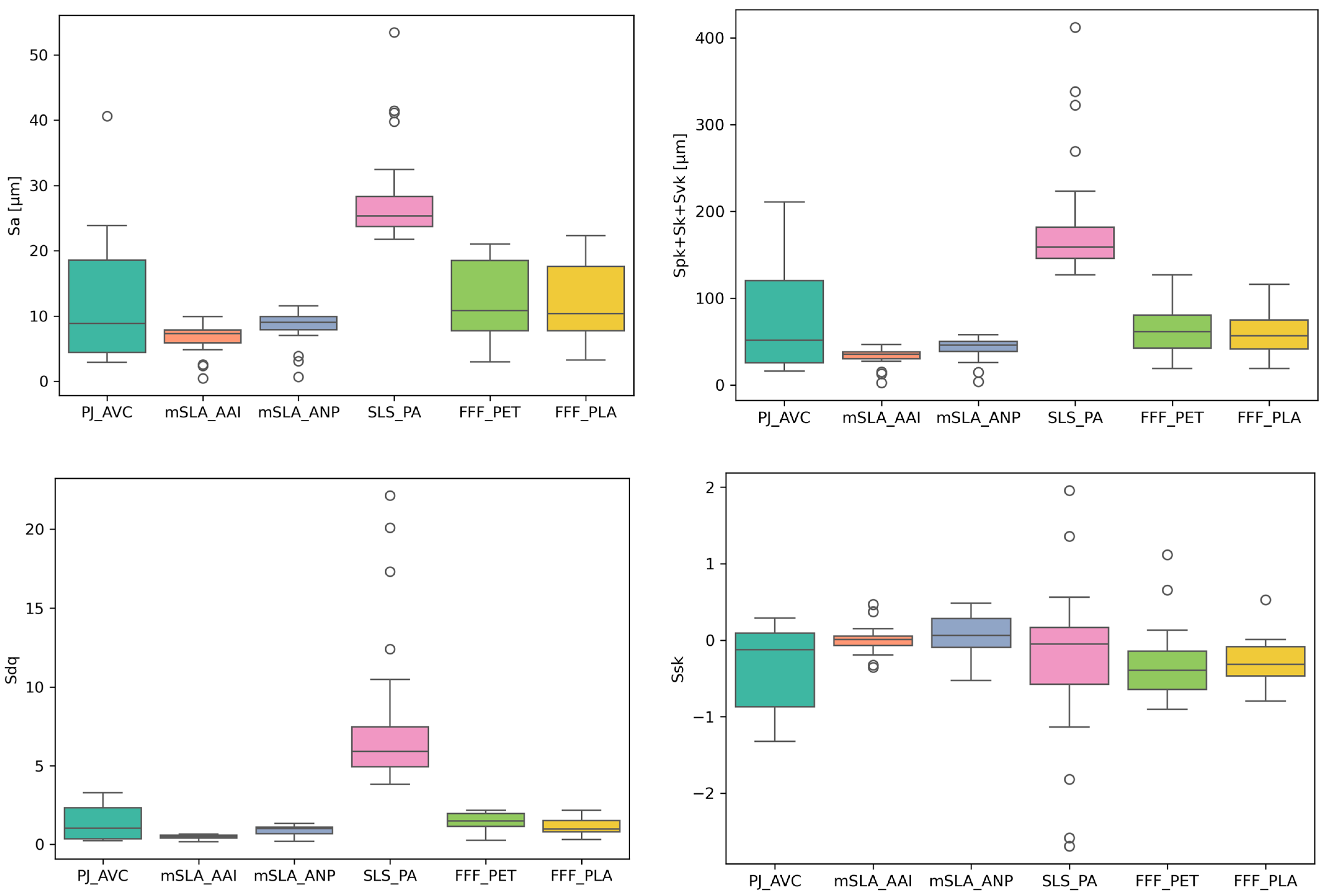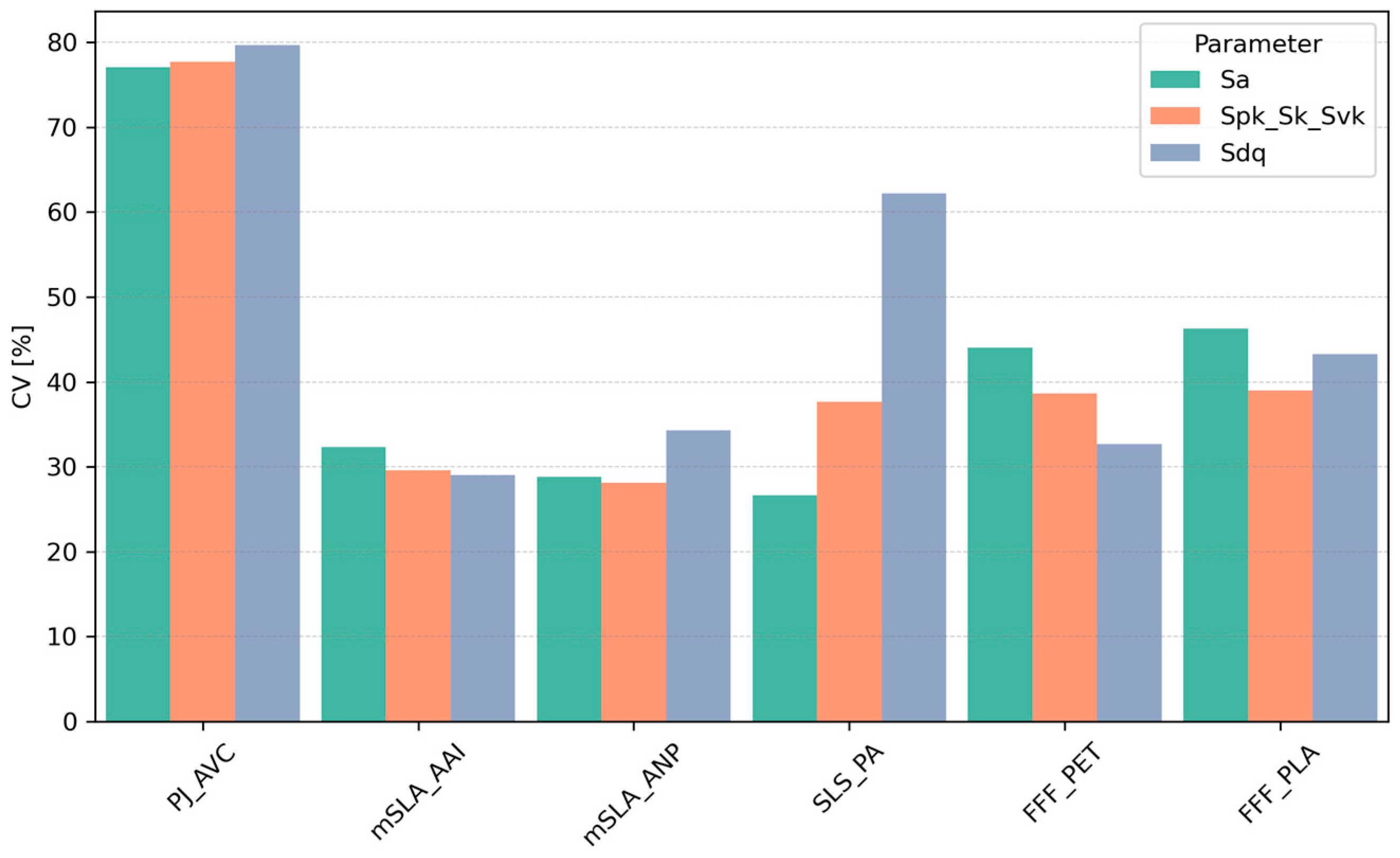 Figure 8). Moderate variability was associated with FFF samples (CV 33–46%, depending on parameter). Samples refered as mSLA exhibited the lowest variability (CV 29–35%). For SLS technology, the CV for Sa and Spk + Sk + Svk was comparable to mSLA and FFF. However, SLS samples showed greater variability in terms of surface slope steepness (Sdq). In