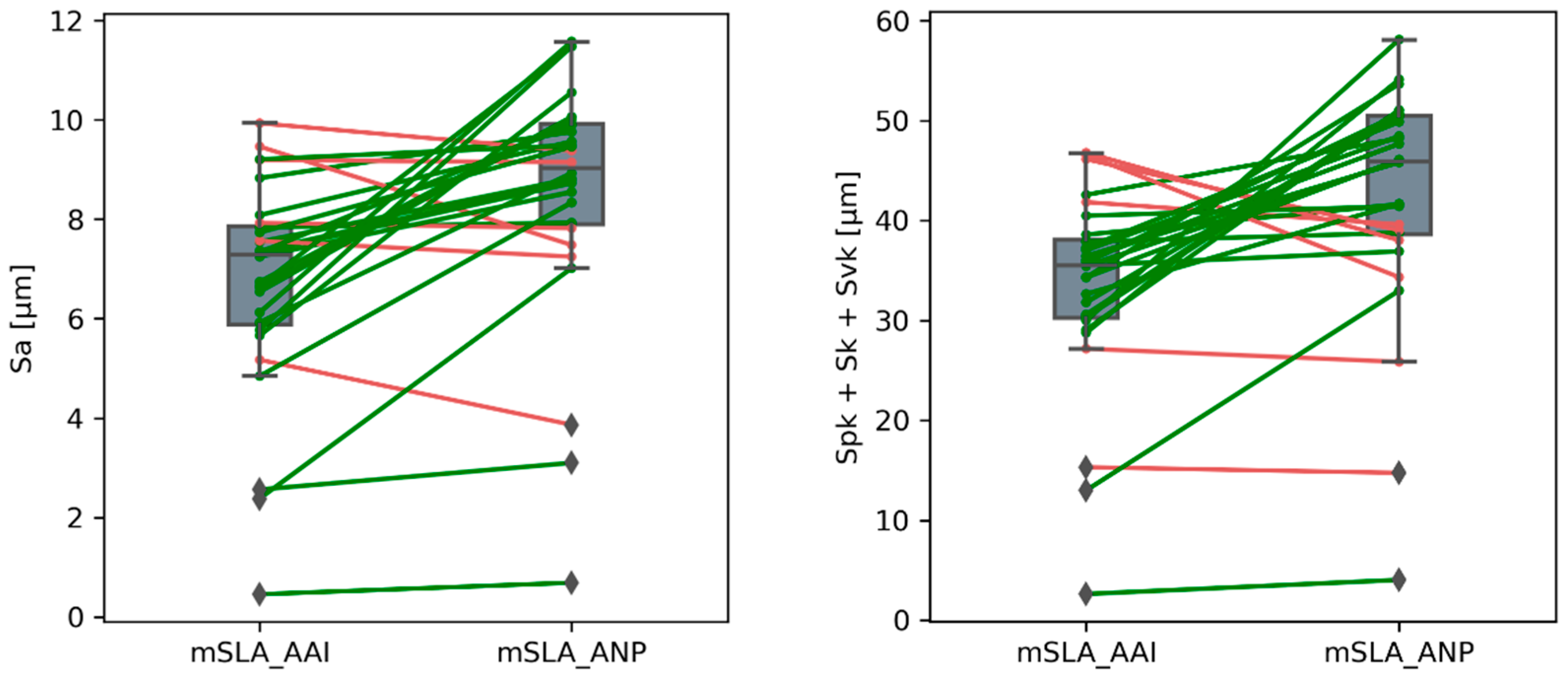 36]. The lowest mean values of these parameters were observed for samples produced using the mSLA technology (for both tested materials): Sa = 6.72 µm (mSLA_AAI) and 8.54 µm (mSLA_ANP), while Spk + Sk + Svk = 33.36 µm and 42.16 µm, respectively.