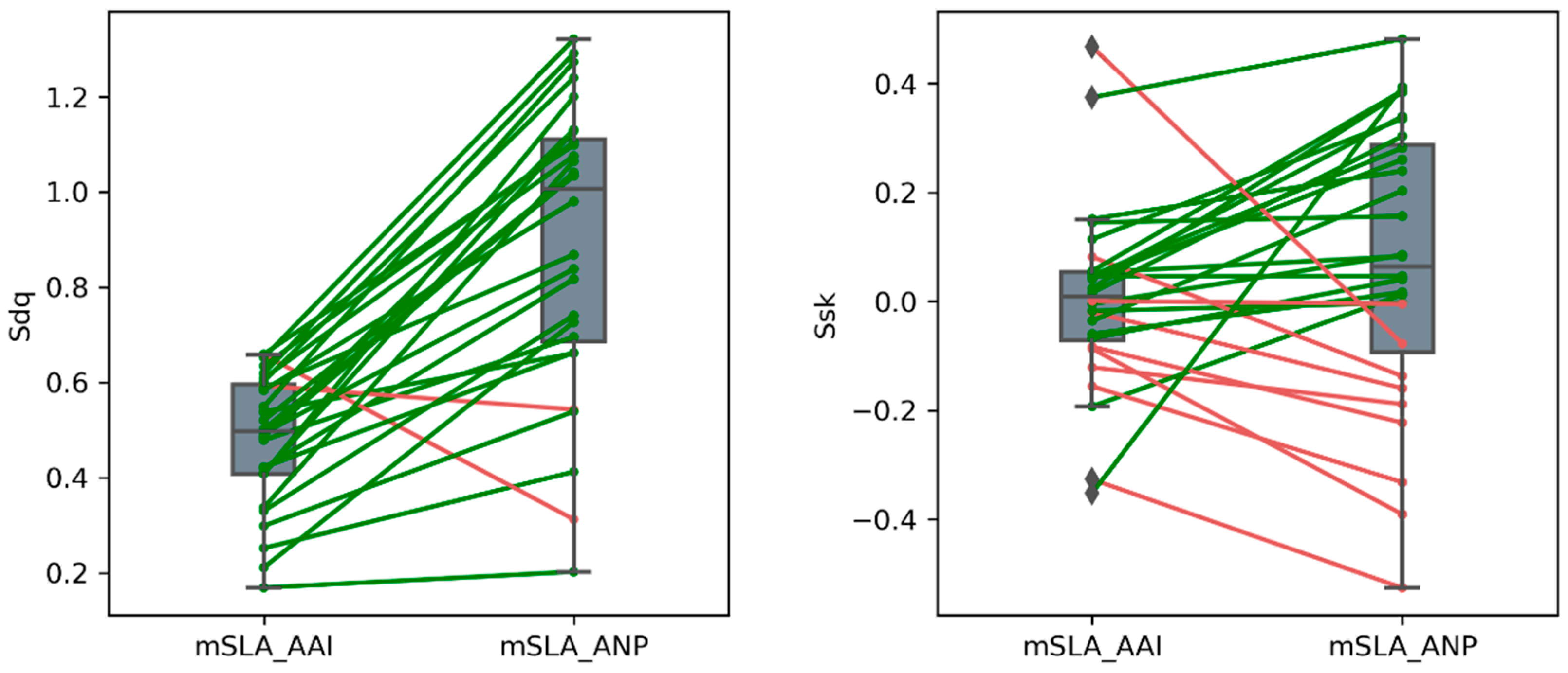 3.1. Influence of Samples’ Type on Surface Topography