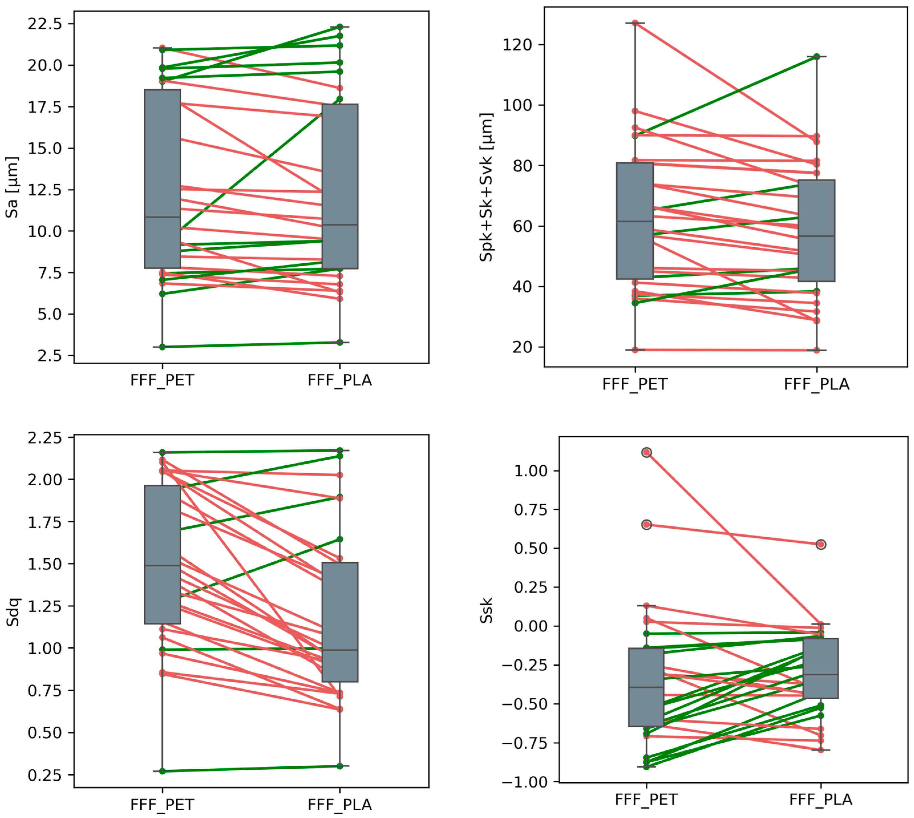 Analysis of the paired differences between FFF_PET and FFF_PLA samples showed that the mean values of Sa, Spk + Sk + Svk, and Ssk were statistically equal. In the case of the Sdq parameter, however, statistically significant differences were observed (