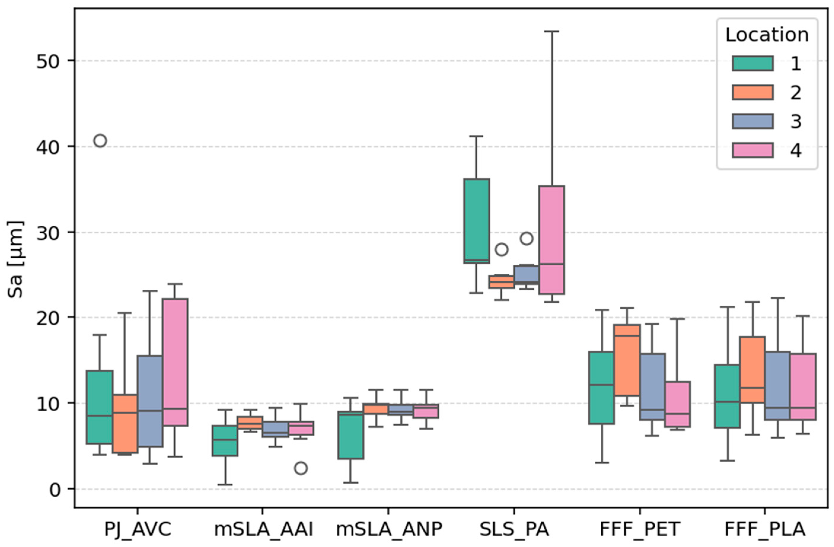 Next, the influence of measurement location on surface topography parameters was examined separately for each sample. ANOVA tests (with angle as a pairing factor) did not reveal a statistically significant effect of measurement location on parameter values. However, for mSLA samples, the variability of Sa and Spk + Sk + Svk at location 1, corresponding to the flat surface, was notably higher than at other locations (