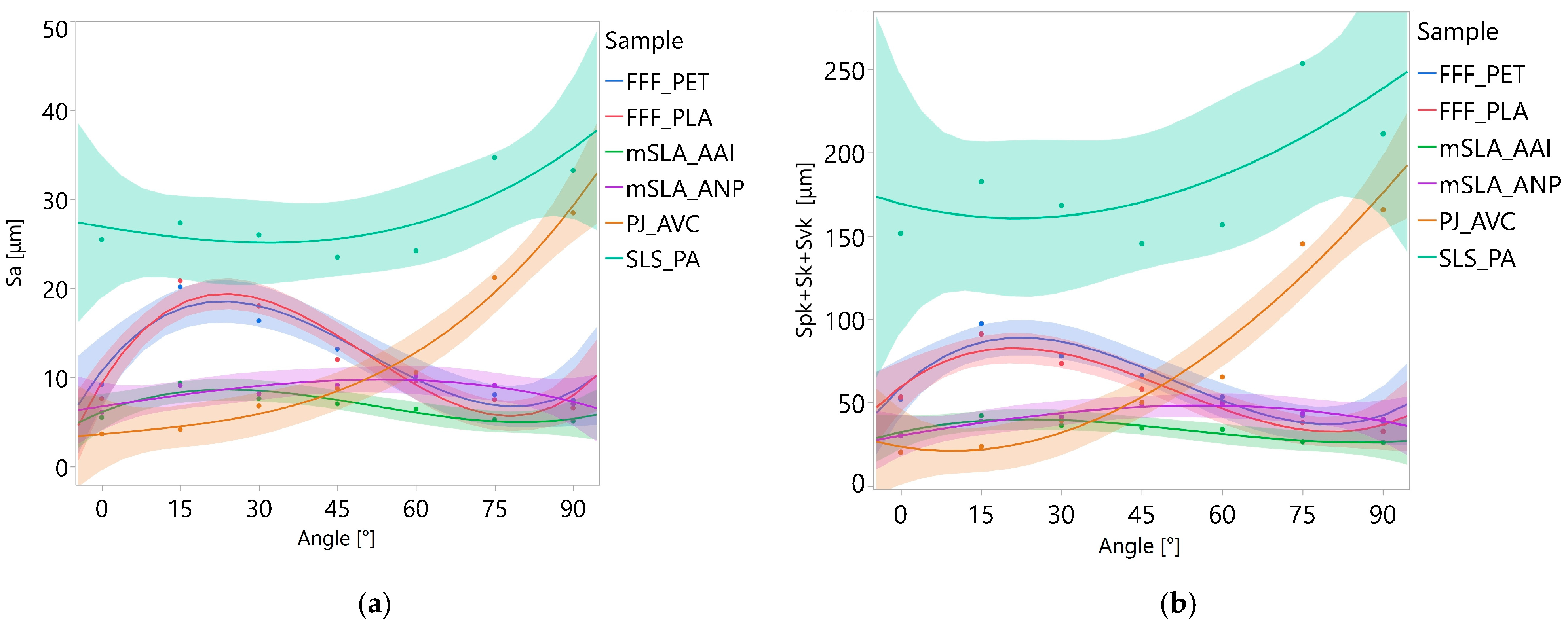 For FFF_PET samples, statistically significant relationship was found between print angle and the parameter Spk + Sk + Svk. For FFF_PLA samples, a significant relationship was observed for Sa. The parameters Sa and Spk + Sk + Svk are strongly correlated with each other (the Pearson correlation coefficient for these is 0.93), and tests on paired data did not show any statistically significant differences between the PLA and PET samples. Therefore, it could be assumed that the relationships for the FFF_PLA and FFF_PET samples would be similar. Their similarity is indeed visible in the plots shown in
