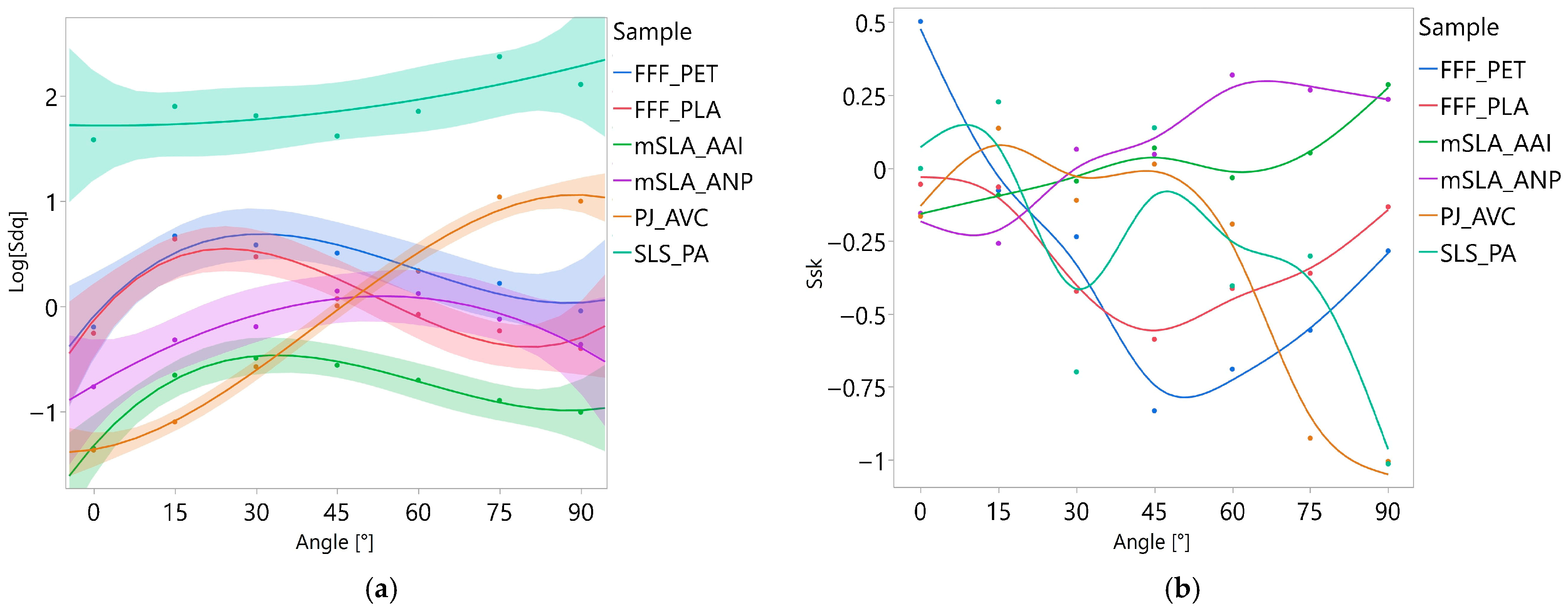 Figure 14. Although the optimal polynomial degree for each combination of parameter and material was determined based on the AIC, the curves in the graphs were uniformly presented as third-degree polynomials. This uniform presentation served purely illustrative purposes and ensured visual consistency across the figures, especially since the shapes of second- and third-degree curves differed only slightly within the analyzed range of angles. While regression models were fitted using either logarithmically transformed or untransformed dependent variables, the graphical presentation was always based on untransformed data to facilitate interpretation. This approach makes the results more intuitive, as the surface texture parameters have a direct geometric meaning, whereas interpreting relationships on a logarithmic scale would be less straightforward for the reader.