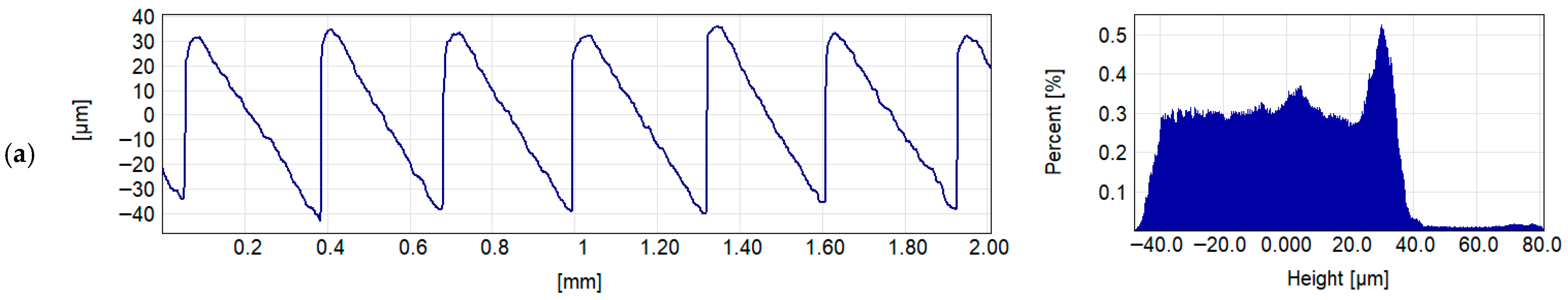 Figure 4) exhibit a directional character. In the case of FFF samples, with relatively large layer thicknesses of 0.08 mm, individual material layers are clearly visible. The peaks corresponding to the filament strands are inclined relative to the mean plane at an angle determined by the slicing of the model into layers.