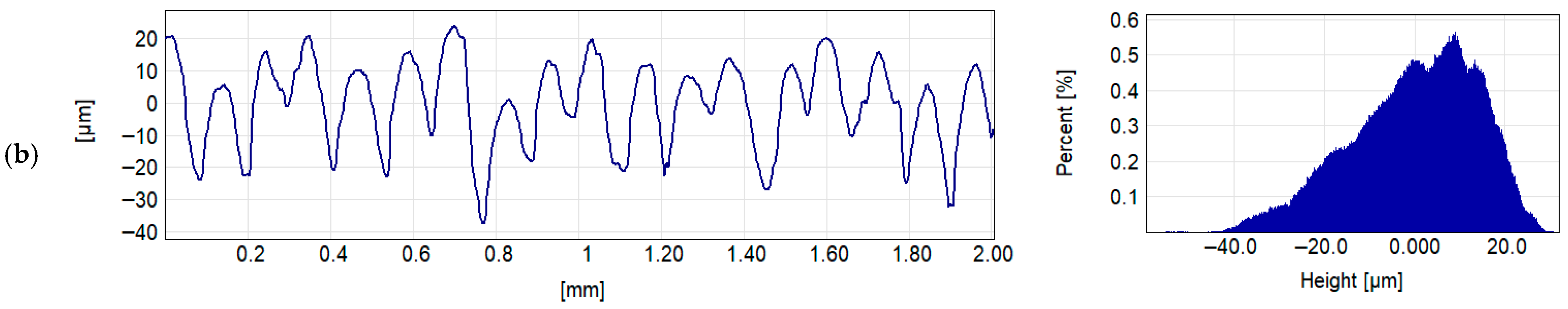 58]. However, when interpreting the roughness parameters, it should be emphasized that when verifying surfaces made with SLS method, the most significant variability in measurement results occurred, mainly due to the granular structure of the test sample’s surface.