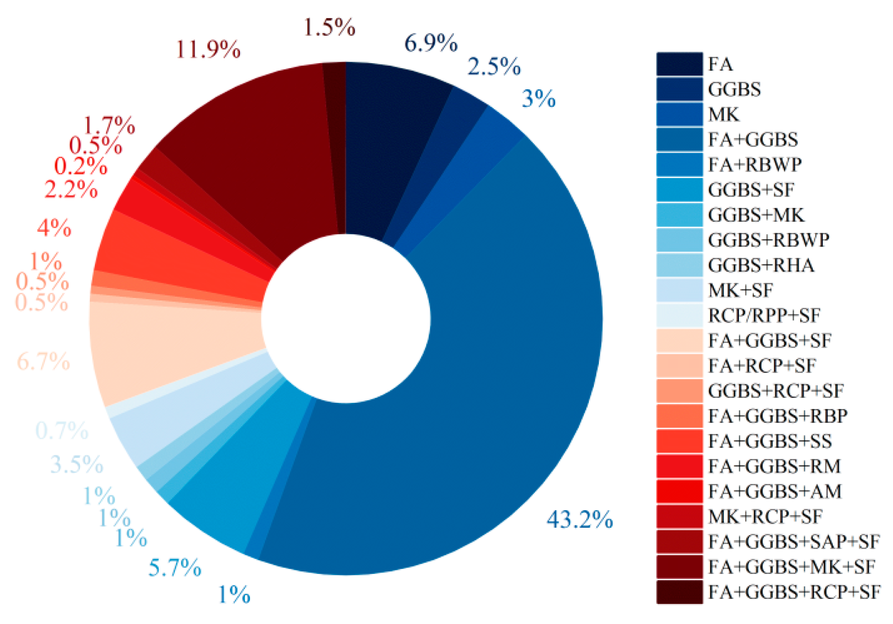 | FA, GGBS, SF, MK (SH + SSI) [57,66,67,69,90] | Normal temperature curing (standard curing room/box (20 ± 2 °C, ≥95%R.H.); Standard curing room (17~23 °C, ≥90% R.H.) to 28 d). |