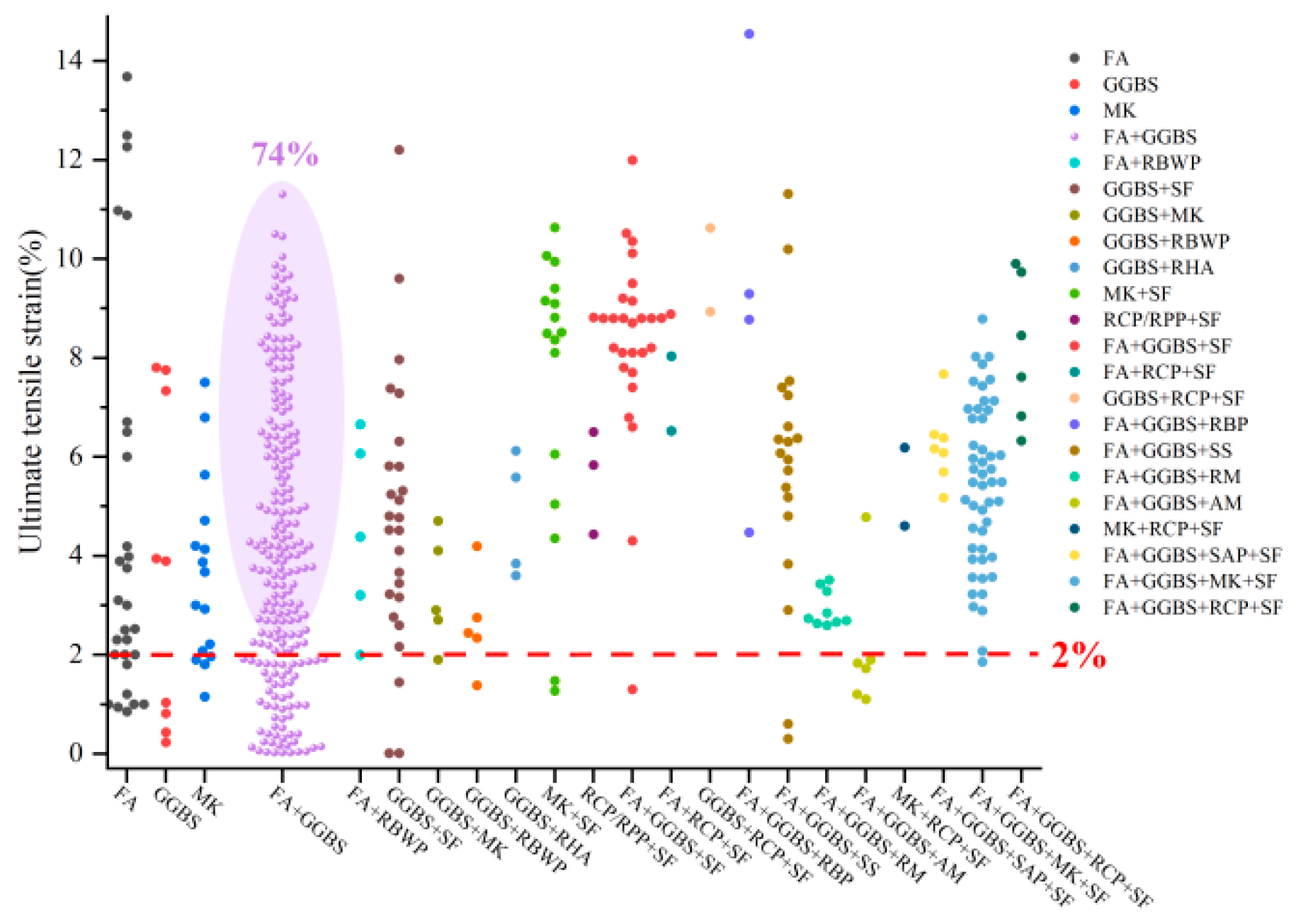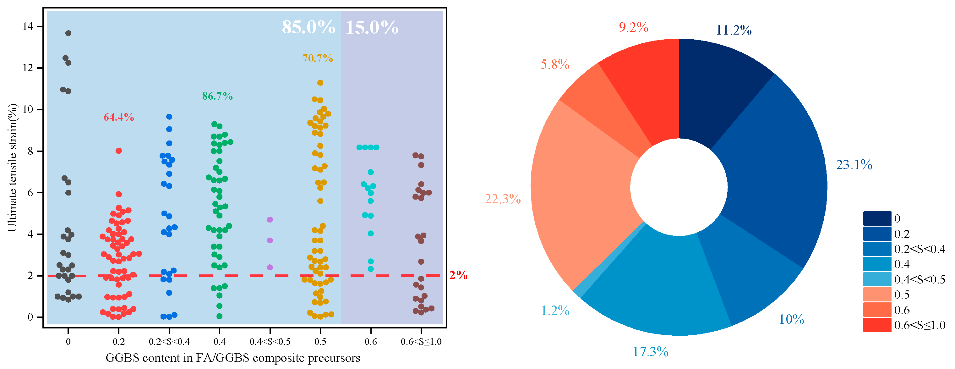 - The compressive strength of EGC ranges from 20–120 MPa, satisfying structural requirements. Most high-performance EGCs achieving ultimate tensile strains ≥ 2% have matrix strengths between 25–50 MPa. For FA-GGBS and fly ash-only systems, tensile performance tends to improve with increasing matrix strength, peaking at an optimal range before declining.