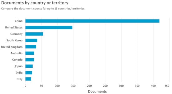 Figure 3 shows the publication activity related to the direct recycling of lithium-ion batteries (LIBs) in individual countries. The analysis of the data clearly shows that China generates the largest number of scientific publications in this area. This is entirely justified, given the country’s dominant position in the global lithium-ion battery supply chain. It is in China that most of the plants producing both cells and complete battery systems are located, as well as extensive research and development (R&D) facilities related to cathode, anode, and electrolyte technologies. China’s dominance in scientific publications may also be linked to the growing emphasis by the authorities on implementing circular economy solutions and the dynamic development of the electromobility industry. The large scale of battery production and consumption in this country generates huge amounts of used LIBs, which naturally stimulates research into their recovery and reuse. By comparison, countries such as the United States, South Korea, Germany, and the United Kingdom show significantly less, though still significant, activity in the field of direct LIB recycling research. These countries are conducting highly advanced technological work, often focused on optimizing cathode material regeneration processes and increasing the efficiency and safety of industrial raw material recovery. China’s observed advantage in the number of scientific publications not only reflects its production potential, but also indicates the strategic focus of national research policy on the development of sustainable recycling technologies, which may be a key element of the global lithium-ion battery market in the future [19].