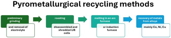 Pyrometallurgical methods of recycling lithium-ion batteries are among the oldest and most technologically advanced industrial solutions. This process is based on high-temperature processing of used cells, including roasting, melting, and reduction of metal oxides to obtain a metal alloy containing valuable elements such as cobalt, nickel, copper, and iron [30,48,49].