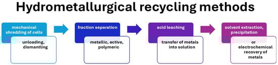 Hydrometallurgical methods offer significant advantages for lithium-ion battery recycling, particularly due to their ability to selectively dissolve and precipitate valuable metals while minimizing waste. Although this process is promising, continuous improvements in reagent selection, process optimization, and environmental management are necessary to increase the efficiency and sustainability of these recycling methods in the context of a circular economy. Figure 5 shows a diagram of the hydrometallurgical recycling process for lithium-ion batteries (LIBs), including its typical technological stages. The process begins with the preliminary preparation of used cells, including their discharge, disassembly, and mechanical shredding, followed by the separation of the metallic, active, and polymer fractions. The next stage is acid leaching, which allows the metals to pass into solution. The resulting solution is then subjected to solvent extraction, precipitation, or electrochemical metal recovery, allowing for the selective recovery of cobalt, nickel, lithium, and other valuable elements. This diagram illustrates the classic sequence of steps characteristic of the hydrometallurgical approach to LIB recycling, which is dominated by chemical processes leading to metal recovery while maintaining the structure of active materials in solution form.
