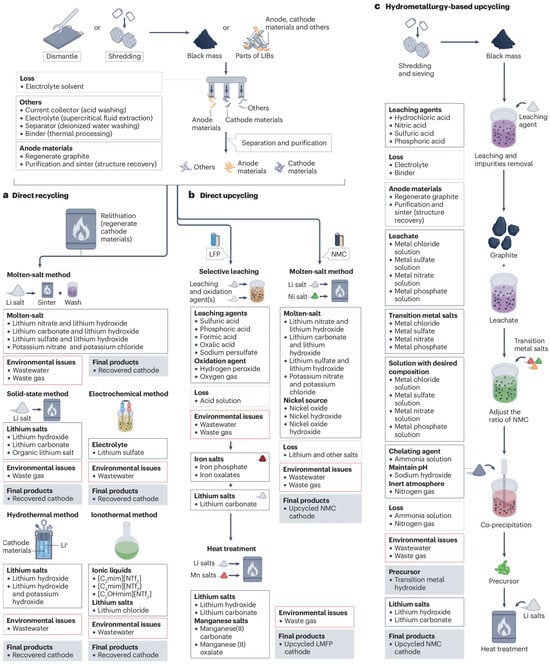 - Li, S.; Wu, Z.; Zhang, M.; Xu, J.; Jin, Z.; Gan, Y.; Xu, Z.; Wang, Q.; Zhang, W.; Xia, Y.; et al. Direct Recycling of Cathode Materials from Spent Lithium-Ion Batteries: Principles, Strategies, and Perspectives. Chem. Eur. J. 2025, 31, e202404461. [Google Scholar] [CrossRef]