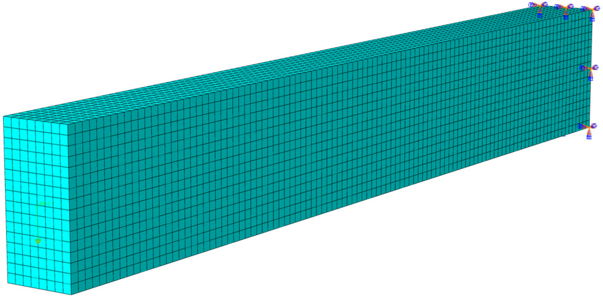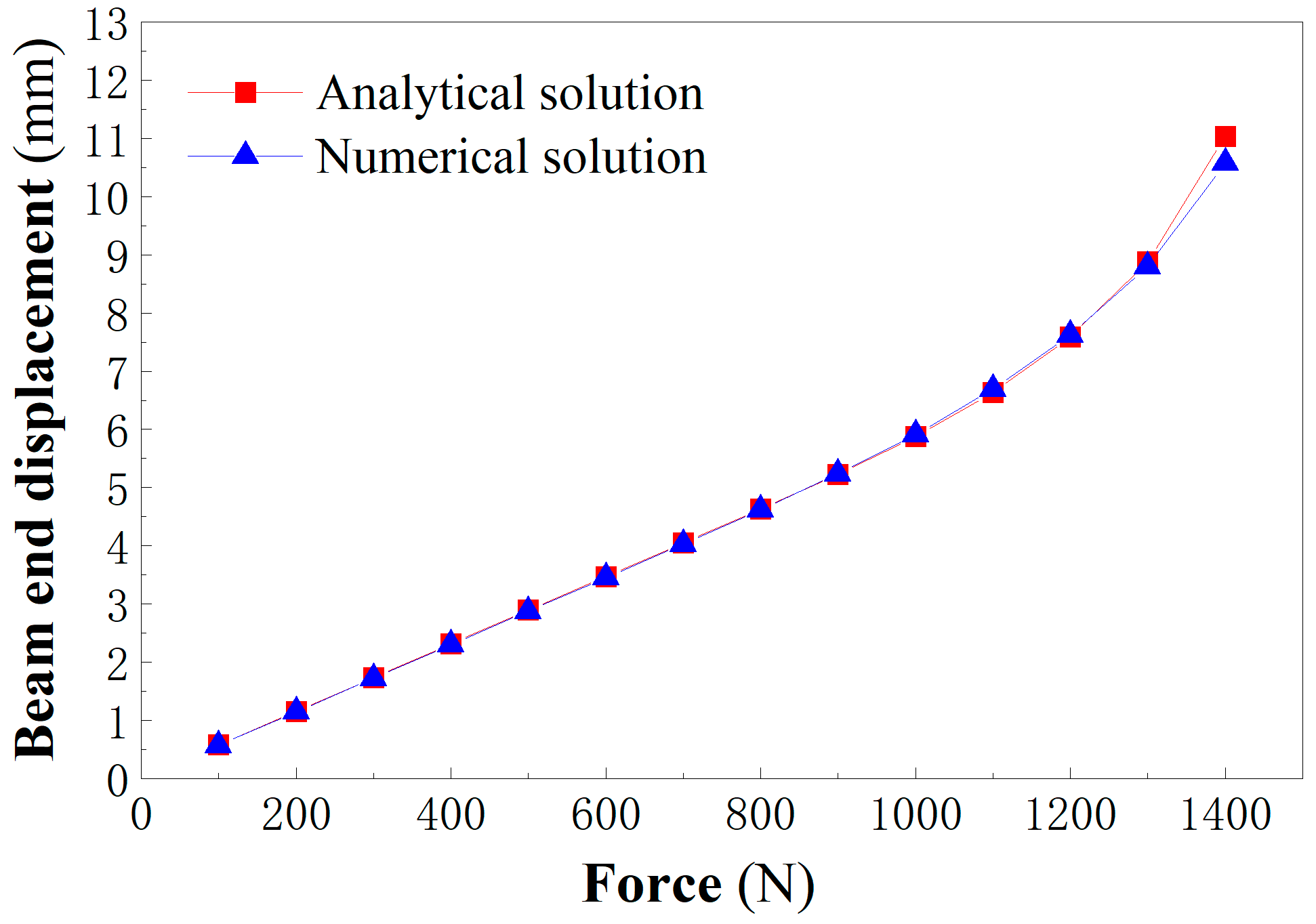 | Concentrated Forces (N) | Analytical Solutions (mm) | Numerical Results (mm) | Relative Errors (%) |