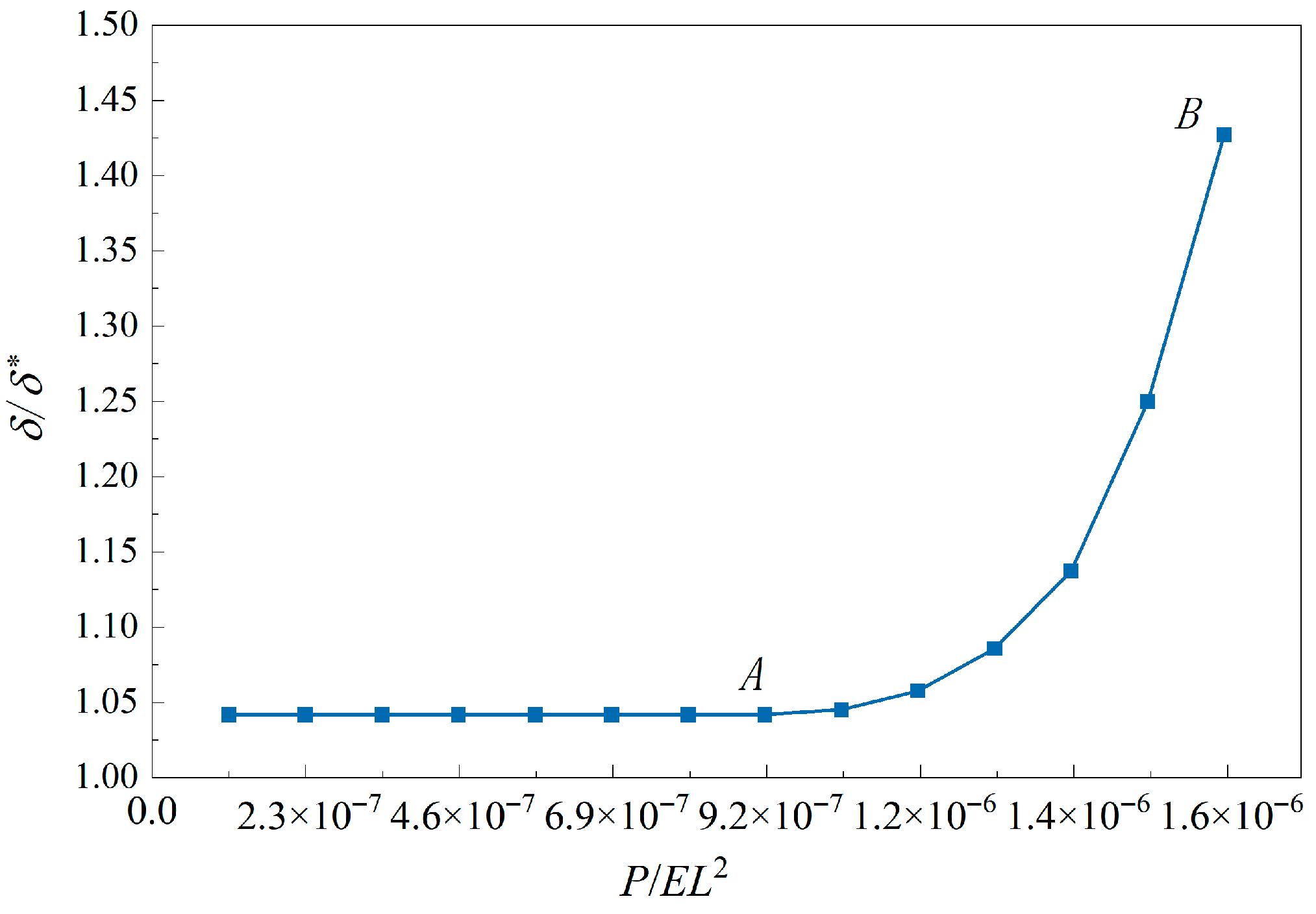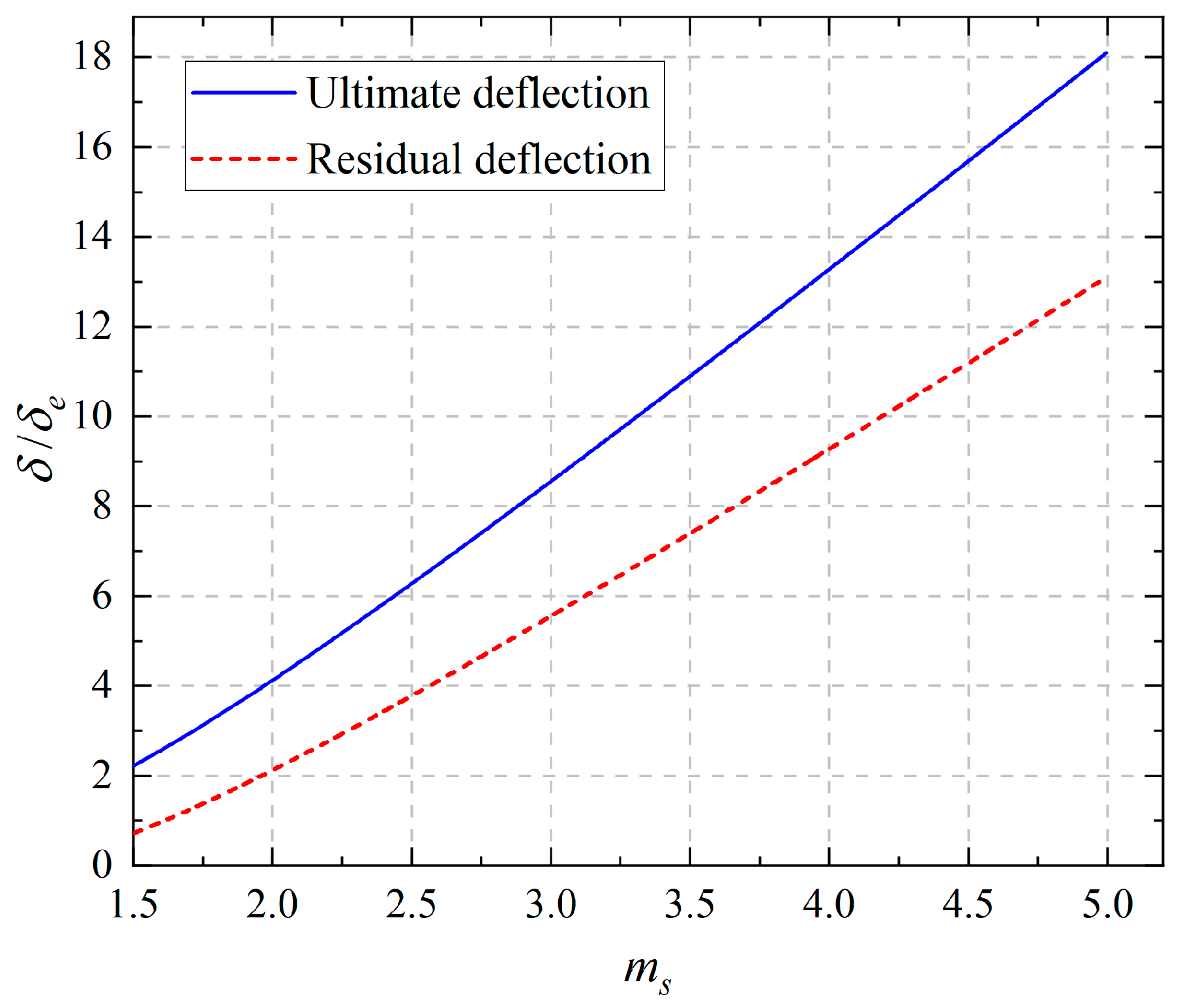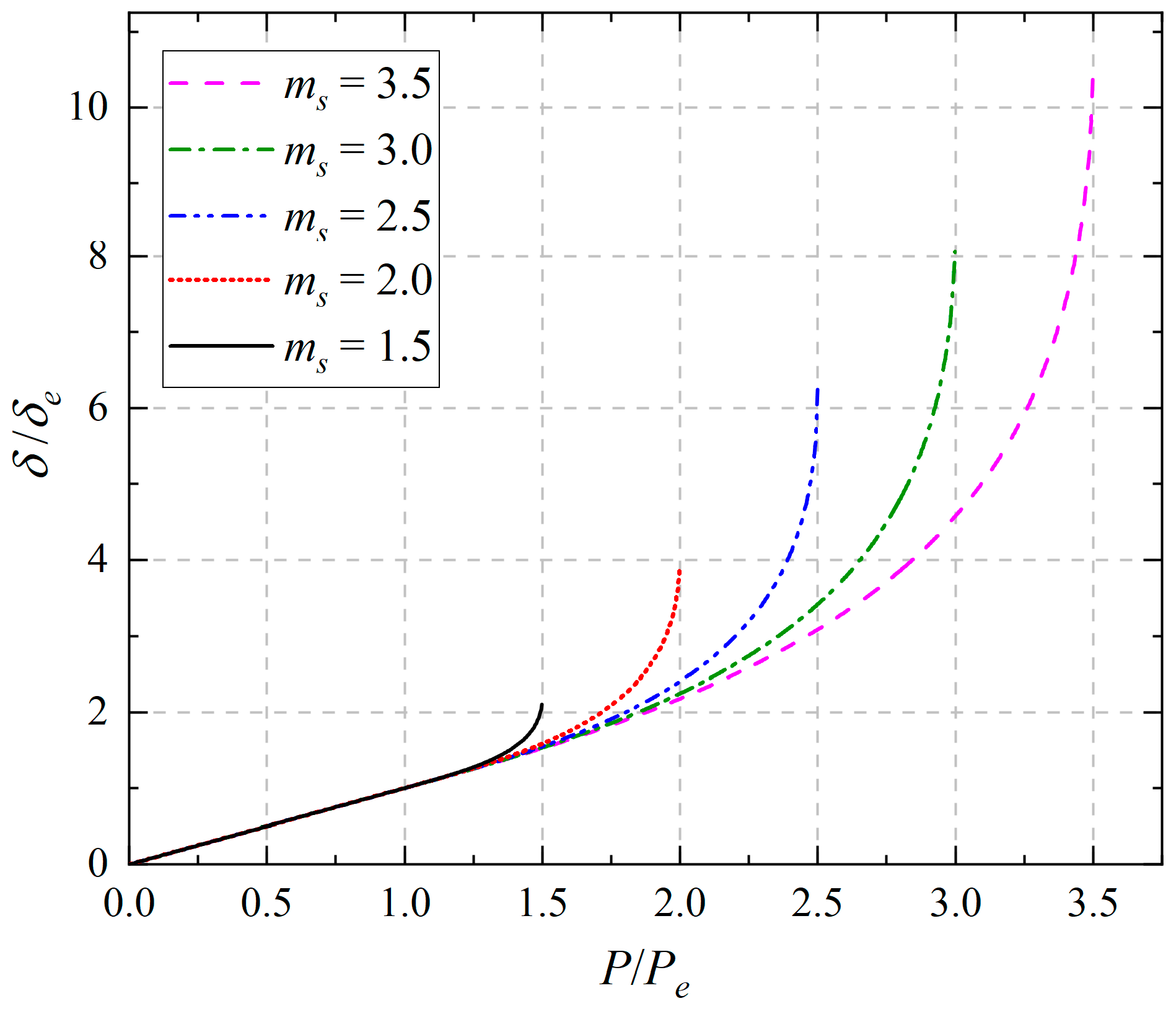 - The consideration for the tension–compression asymmetry will enlarge the influence on the displacement during the elastic–plastic mechanical response; the greater ms values will produce the greater end displacements. Similarly, the end displacement in the classical problem without tension–compression asymmetry is minimal.