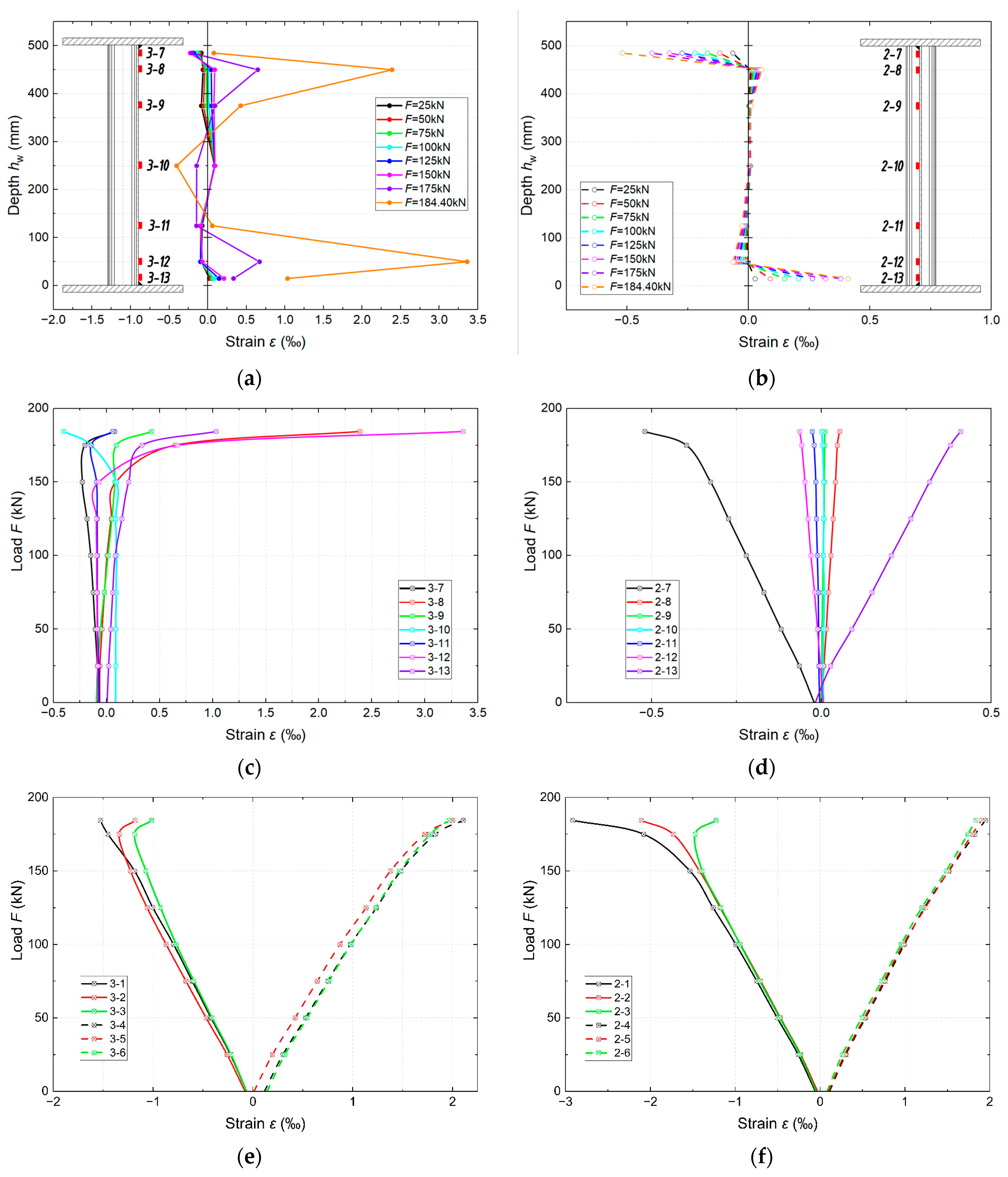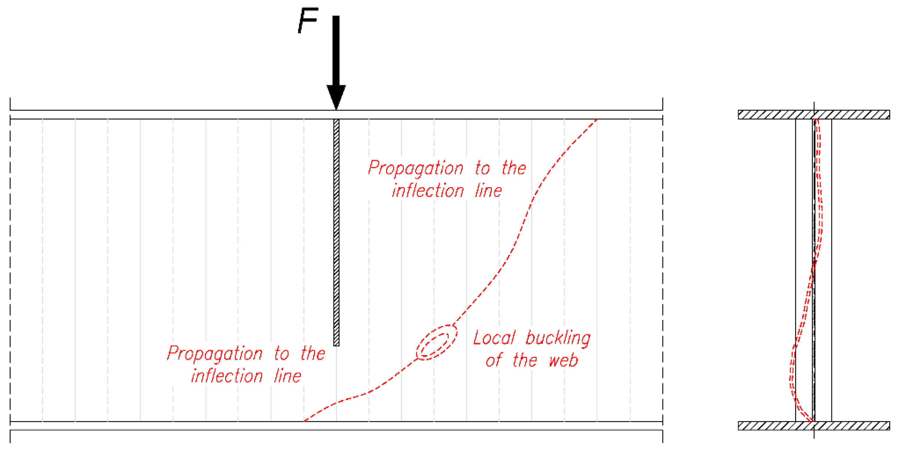 - Failure mechanisms. Two main failure mechanisms were observed: (I) local buckling of the sinusoidal web combined with yielding of the flanges, and (II) a combined failure involving local web buckling and global lateral–torsional buckling after prior cyclic loading. The second mechanism occurred only in the pre-fatigued specimen with significant residual torsional deformations.