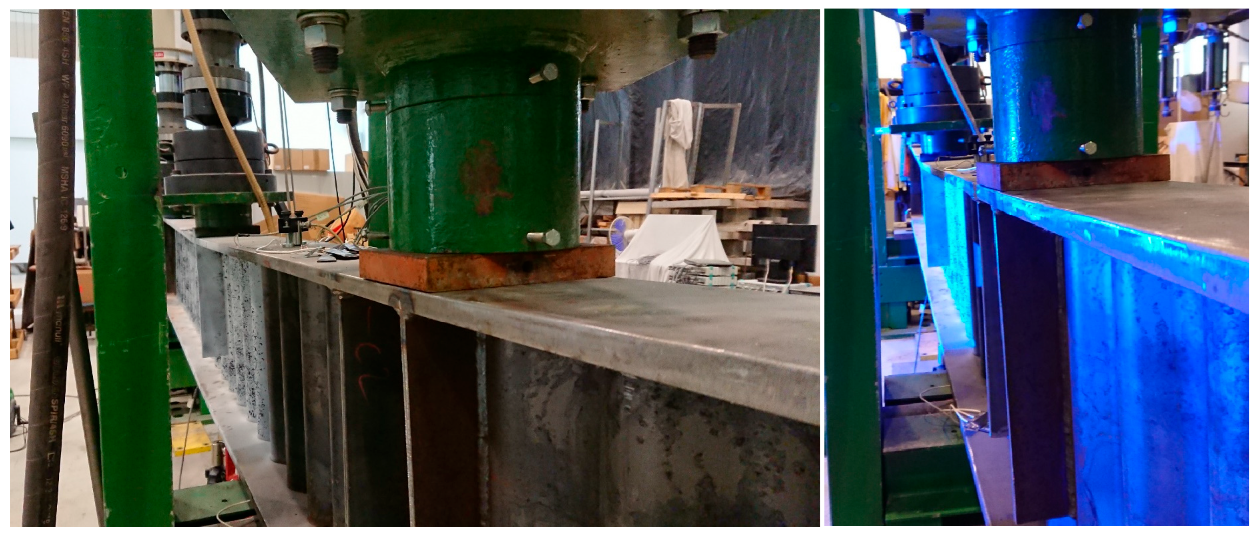- Jáger, B.; Dunai, L.; Kövesdi, B. Lateral-Torsional Buckling Strength of Corrugated Web Girders—Experimental Study. Structures 2022, 43, 1275–1290. [Google Scholar] [CrossRef]