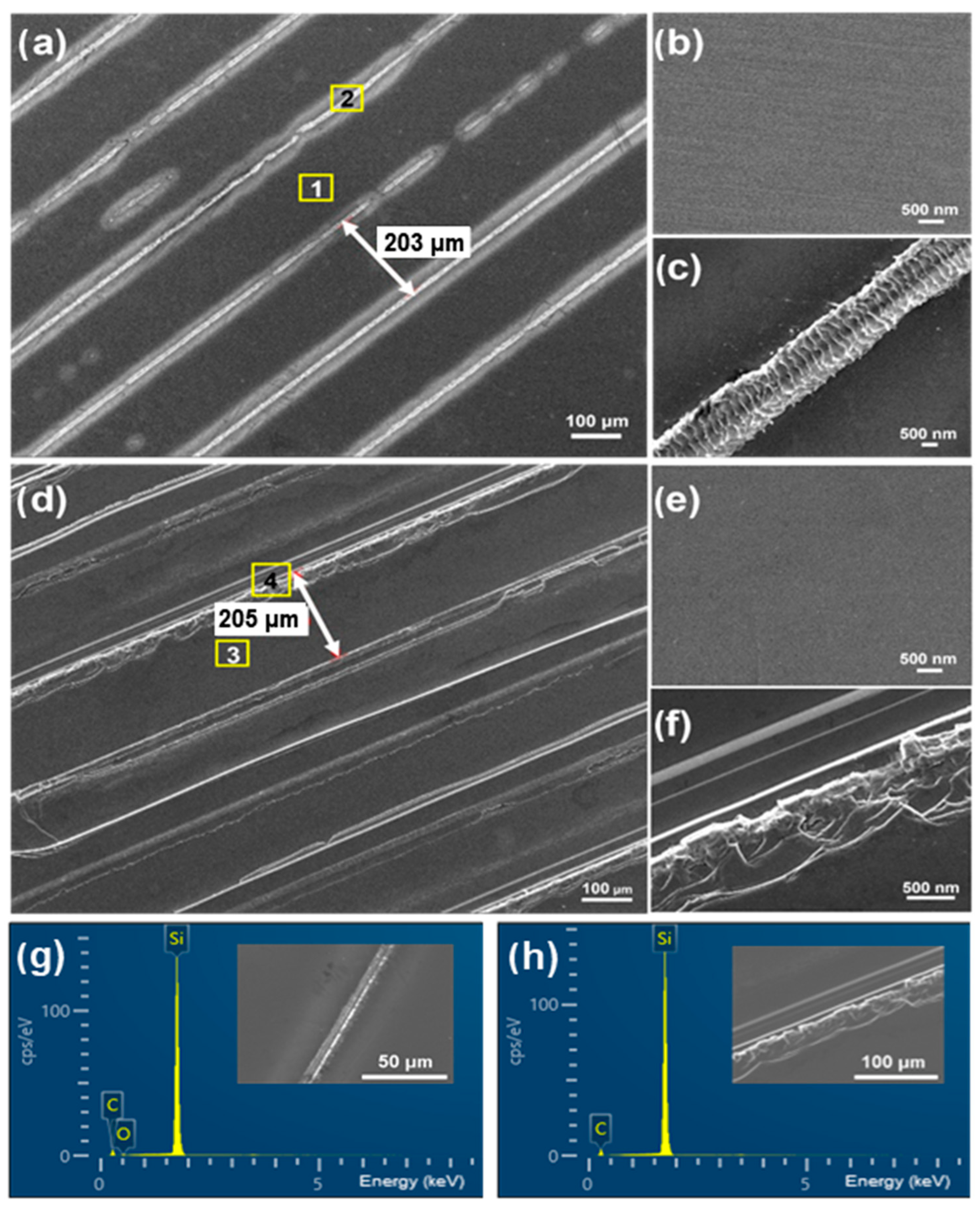 - Wang, H.; Chen, Q.; Yao, Y.; Che, L.; Zhang, B.; Nie, H.; Wang, R. Influence of Surface Preprocessing on 4H-SiC Wafer Slicing by Using Ultrafast Laser. Crystals 2022, 13, 15. [Google Scholar] [CrossRef]
