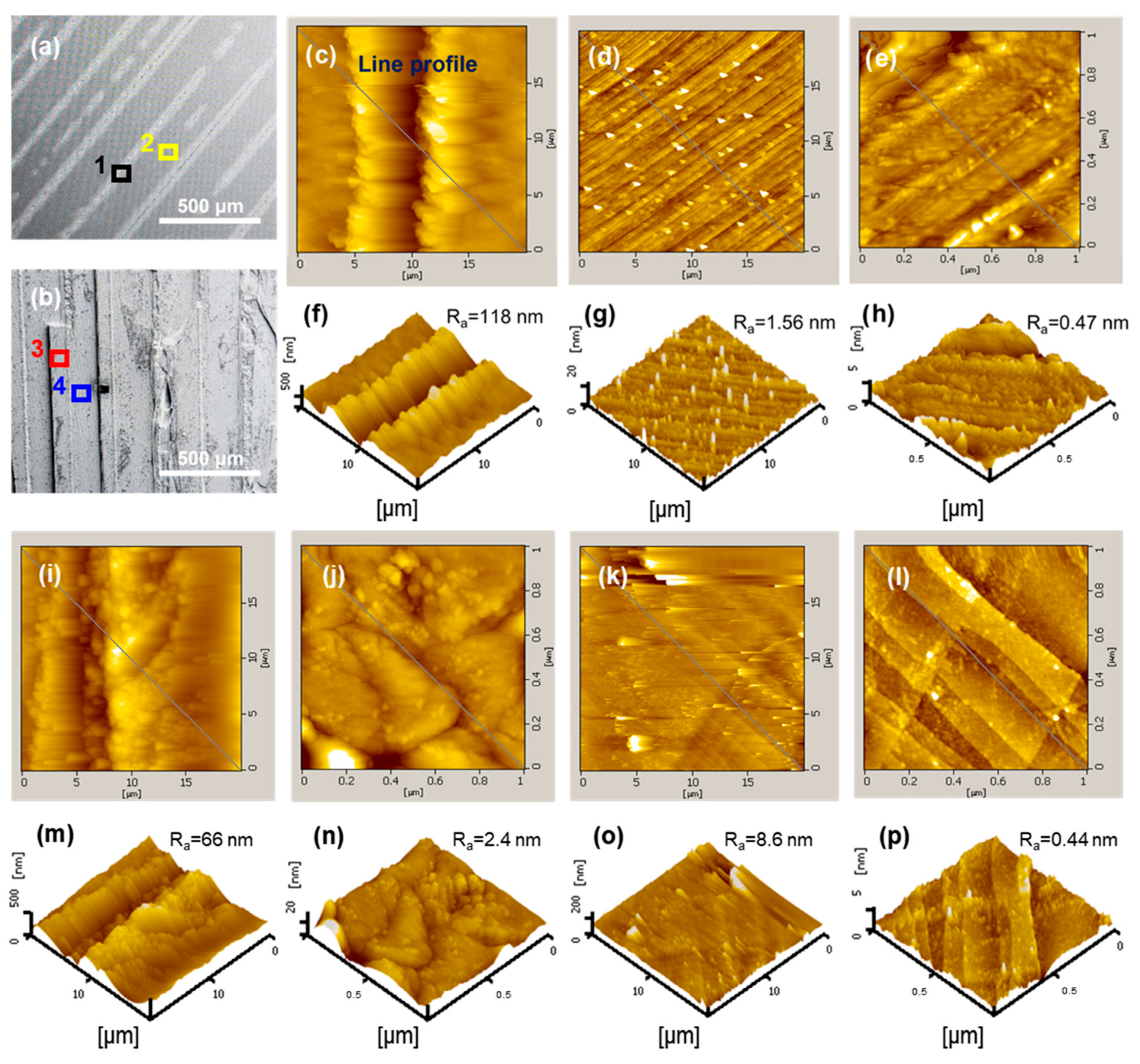 - Wang, C.; Kurokawa, S.; Doi, T.; Yuan, J.; Fan, L.; Mitsuhara, M.; Lu, H.; Yao, W.; Zhang, Y.; Zhang, K. SEM, AFM and TEM Studies for Repeated Irradiation Effect of Femtosecond Laser on 4H-SiC Surface Morphology at Near Threshold Fluence. ECS J. Solid. State Sci. Technol. 2018, 7, 29–34. [Google Scholar] [CrossRef]