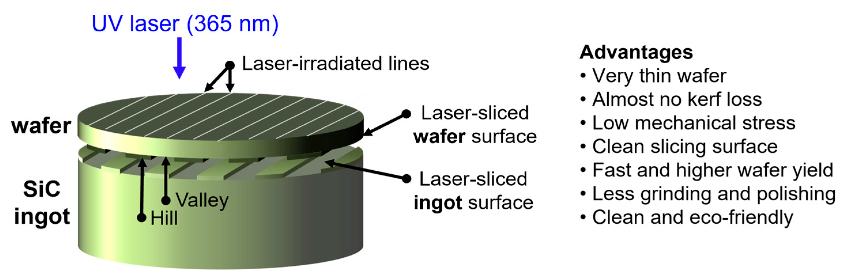 - Zhang, J.; Li, B.; Chen, Q.; Yao, Y.; Che, L.; Fan, H.; Zhang, X.; Zhang, B.; Chen, X.; Wang, R. A review of laser-assisted SiC wafer manufacture: Green and sustainable slicing and planarization for integrated applications. Mater. Today Commun. 2025, 49, 114230. [Google Scholar] [CrossRef]