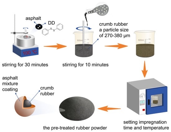 To investigate the effects of the DD pre-impregnation time on the properties of rubber-modified asphalt, the following procedure was employed: 8 phr of asphalt was heated to 100 °C, and 0.6 phr of DD was added and stirred at 200 rpm for 30 min. Subsequently, 8.6 phr of this mixture was added to 35 phr of crumb rubber with a particle size of 270–380 µm. The mixture was then subjected to high-speed blending at 1200 rpm for 10 min using a high-speed mixer until the asphalt mixture was uniformly coated onto the rubber powder surface. The treated rubber powder was then placed in a vacuum drying oven at 90 °C for thermal treatment durations of 4, 8, 12, and 16 h. The process of pre-treating the rubber powder is shown in Figure 1. Thereafter, 92 phr of asphalt was heated to 195 °C, and 43.6 phr of the pre-treated rubber powder was added and stirred at 1000 rpm for varying durations to prepare rubber-modified asphalt samples.