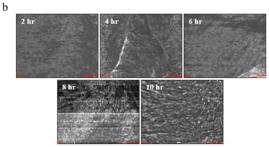 As illustrated in Figure 2a, after 2 h of penetration, the sulfur content is predominantly localized in the peripheral layer of 2hSR, whereas the core layer exhibits the lowest sulfur content, indicating the incomplete inward diffusion of DD. With a prolonged impregnation duration, the sulfur content in the peripheral layer progressively declines, while that in the middle-layer rubber and the core layer increases accordingly, resulting in the continuous attenuation of the radial concentration gradient. By 8 h, the sulfur distribution across all layers converges to a nearly uniform value, signifying that DD’s impregnation has reached equilibrium. Extending the duration to 10 h yields no appreciable variation relative to 8hSR, confirming the establishment of a steady state. Collectively, the data demonstrate that DD penetration from diphenyl ether into the vulcanized rubber sphere follows a time-dependent equilibration process: an initially steep concentration gradient (high surface, low core) gradually flattens until homogeneity is achieved at approximately 8 h. Throughout this period, the total DD content within the sphere increases. The SEM images of the sample surface at different penetration times further confirm the DD penetration. Figure 2b demonstrates a progressive increase in structural looseness at the fracture surface of the vulcanized rubber with extended impregnation times, reaching equilibrium after 8 h. This phenomenon can be attributed to the gradual expansion of entangled polymer chains within the three-dimensional crosslinked network during impregnation [25].
