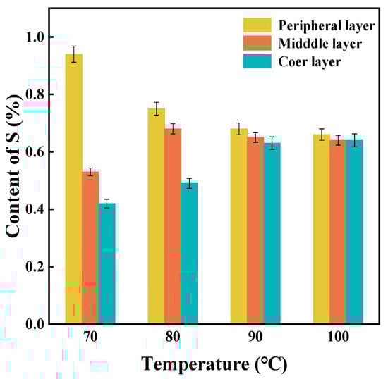 Additional impregnation temperatures were systematically imposed to investigate the effects of the temperature on the diffusion behavior of DD into SR. As shown in Figure 3, the S element content of core-layer rubber increases with rising impregnation temperatures, in contrast to the S element content in middle-layer rubber and peripheral-layer rubber. Specifically, after the temperature reaches 90 °C, the content of the S element diffuses uniformly in SR. This phenomenon can be attributed to the enhanced thermal motion of DD molecules at elevated temperatures, facilitating their accelerated penetration into the rubber crosslinked network. It is worth noting that an increasing temperature also reduces the fractional free volume (FFV) of the vulcanized rubber [25,26]. At lower impregnation temperatures, due to the poor heat transfer of rubber, the reduction in FFV is less pronounced than the enhancement in DD molecular thermal motion, leading to an overall increase in the DD content within the rubber. As the impregnation temperature rises, a balance is eventually reached between the FFV reduction and the intensified thermal motion of DD molecules. Consequently, the DD content approaches saturation and achieves a uniform distribution.