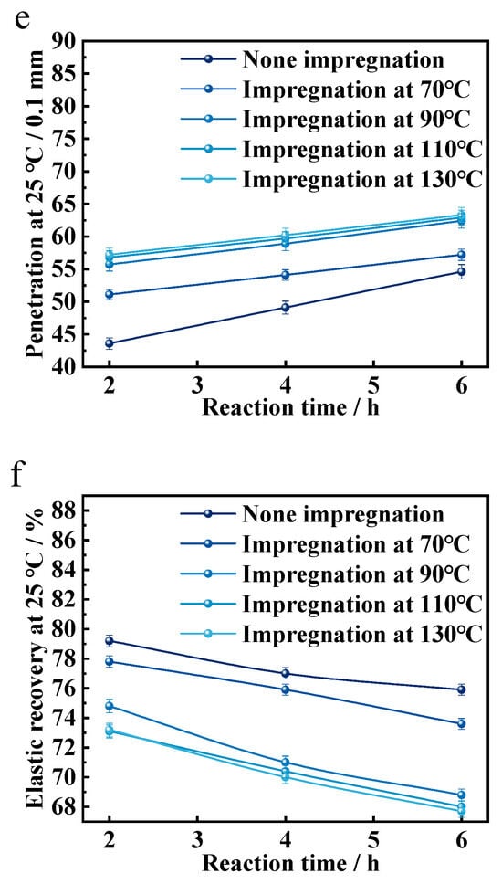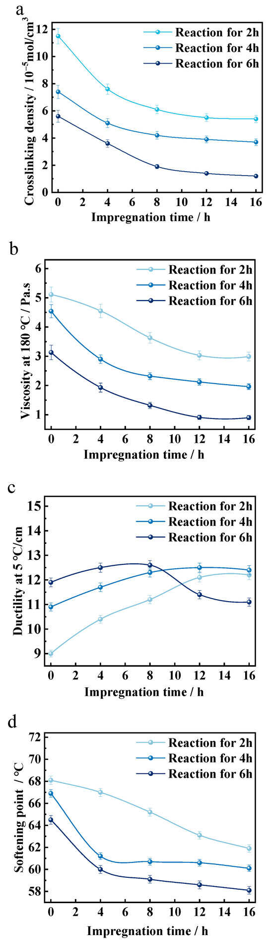 Once DD pre-impregnation reaches equilibrium, further increasing the pre-impregnation temperature of the rubber powder allows DD to form a small amount of active free radicals. During pre-impregnation, these free radicals react with the three-dimensional crosslinked network of the rubber powder, causing de-crosslinking reactions and forming a small amount of quasi-linearized macromolecular rubber fragments. As a result, at the same reaction time, the overall physical properties of rubberized asphalt further deteriorate.