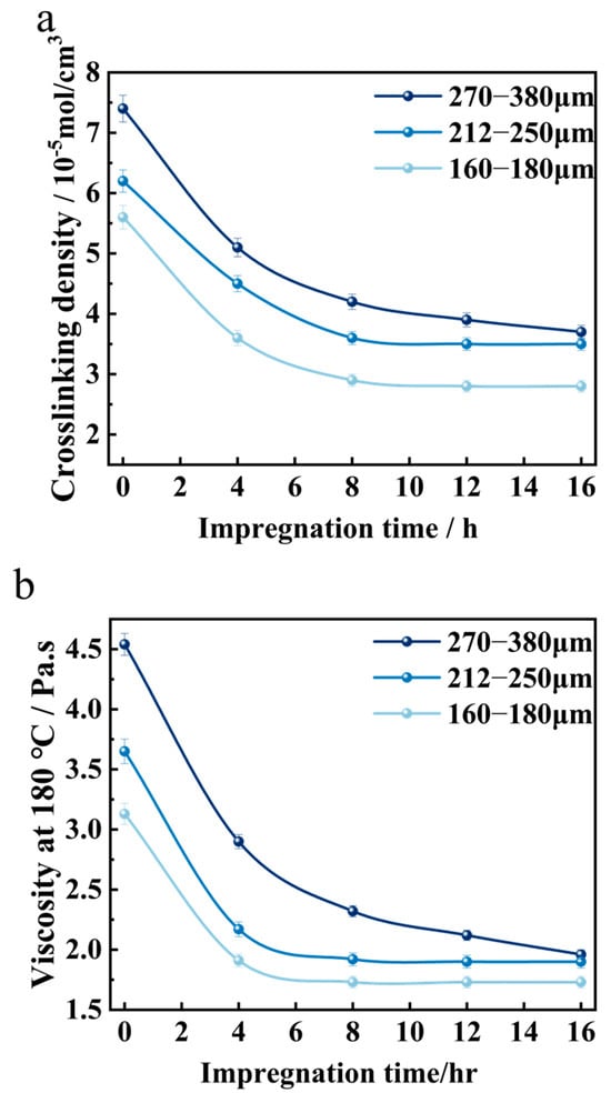 As shown in Figure 7, in high-rubber-content asphalt modified with rubber powder, the rubber powder that has not undergone pre-treatment exhibits the highest crosslinking density after the reaction, and the viscosity of the rubberized asphalt at 180 °C is significantly elevated. With the extension of the pre-treatment time, the crosslinking density of the rubber powder after the reaction decreases. The smaller the particle size of the rubber powder, the shorter the swelling time required to reach equilibrium in the crosslinking density. Upon reaching a treatment duration of 8 h, compared to the untreated state at 0 h, the rubberized asphalt modified with 160–180 μm rubber powder exhibits a 44.7% reduction in viscosity at 180 °C. Additionally, the ductility of the rubberized asphalt at 5 °C rises by 2.5%, the penetration at 25 °C increases by 10.3%, the softening point decreases by 8.2%, and the elastic recovery at 25 °C declines by 6.2%. The smaller the particle size of the rubber powder, the shorter the pre-treatment time required to stabilize the physical properties of the rubberized asphalt. As the particle size of the rubber powder decreases, the crosslinking density after the reaction declines, and the viscosity of the rubberized asphalt at 180 °C also decreases. When the pre-treatment time is less than 8 h, the ductility at 5 °C increases; however, when the pre-treatment time exceeds 8 h, it first increases and then decreases. The softening point of the rubberized asphalt decreases, the penetration at 25 °C increases, and the elastic recovery at 25 °C decreases.