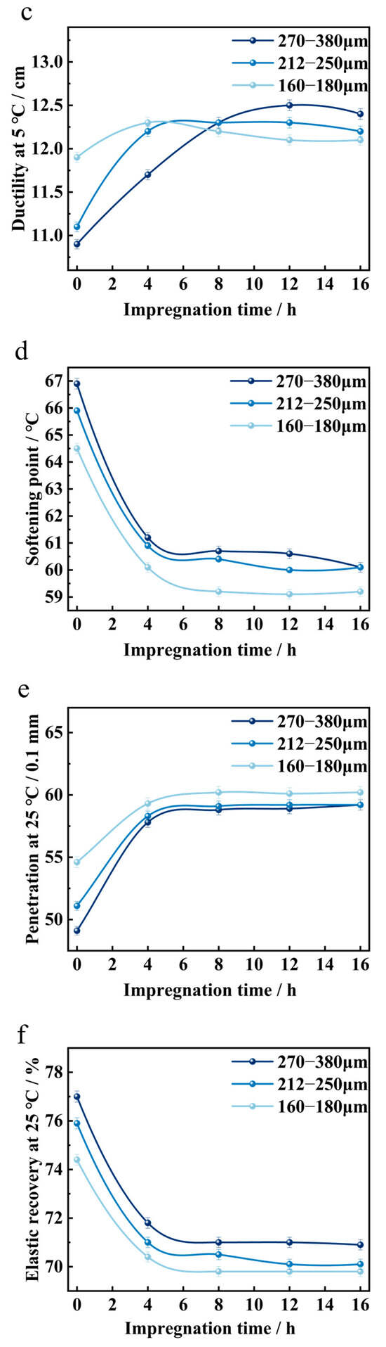 Before DD reaches impregnation equilibrium, the amount of DD that permeates into the rubber powder increases with the extension of the pre-impregnation time of the rubber powder. At the same development time, the efficiency of DD in forming active free radicals and participating in de-crosslinking reactions is higher. Consequently, the de-crosslinking degree of the rubber powder in rubberized asphalt is greater, the crosslinking density is lower, the elasticity is weaker, and the content of quasi-linearized rubber macromolecular fragments is higher. In terms of rubberized asphalt performance, this results in lower high-temperature viscosity, a lower softening point, and lower 25 °C elastic recovery, while the 5 °C ductility and 25 °C penetration are higher.
