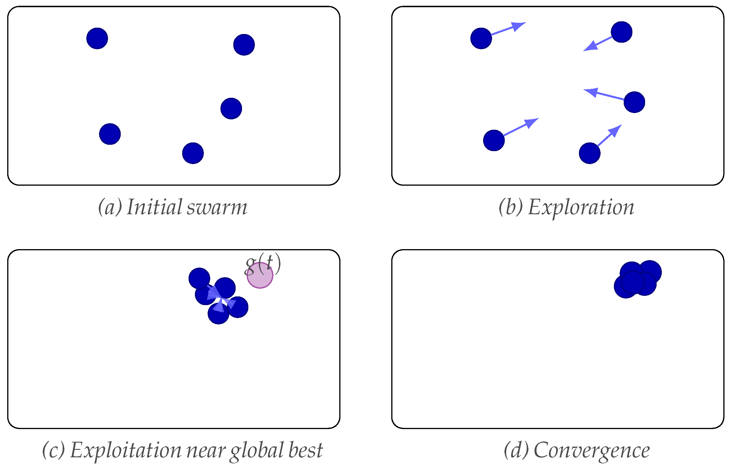 16], PSO has gained broad adoption because of its conceptual simplicity, small number of control parameters, and suitability for parallel computation. The method balances exploration and exploitation through stochastic updates of particle velocities and positions, guided by both personal and global best solutions [