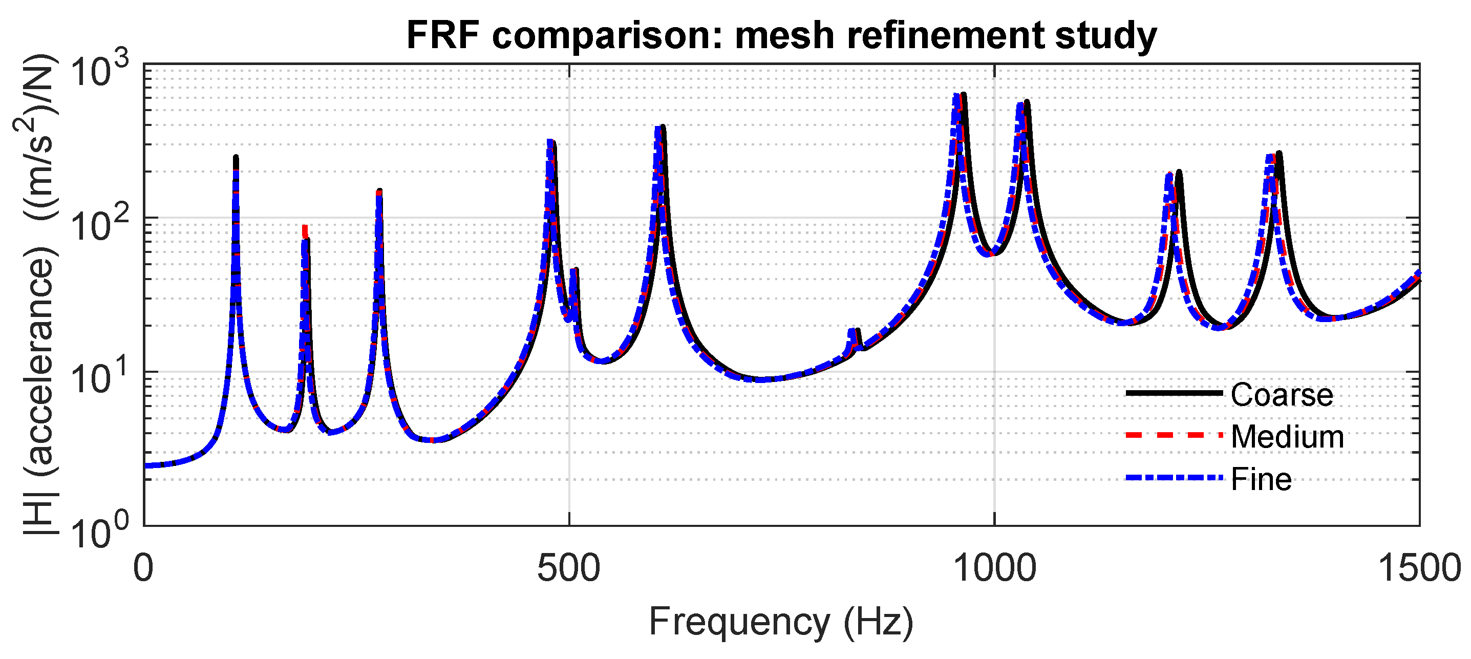 The averaged frequency response functions (FRFs) obtained from the coarse, medium, and fine meshes are compared in