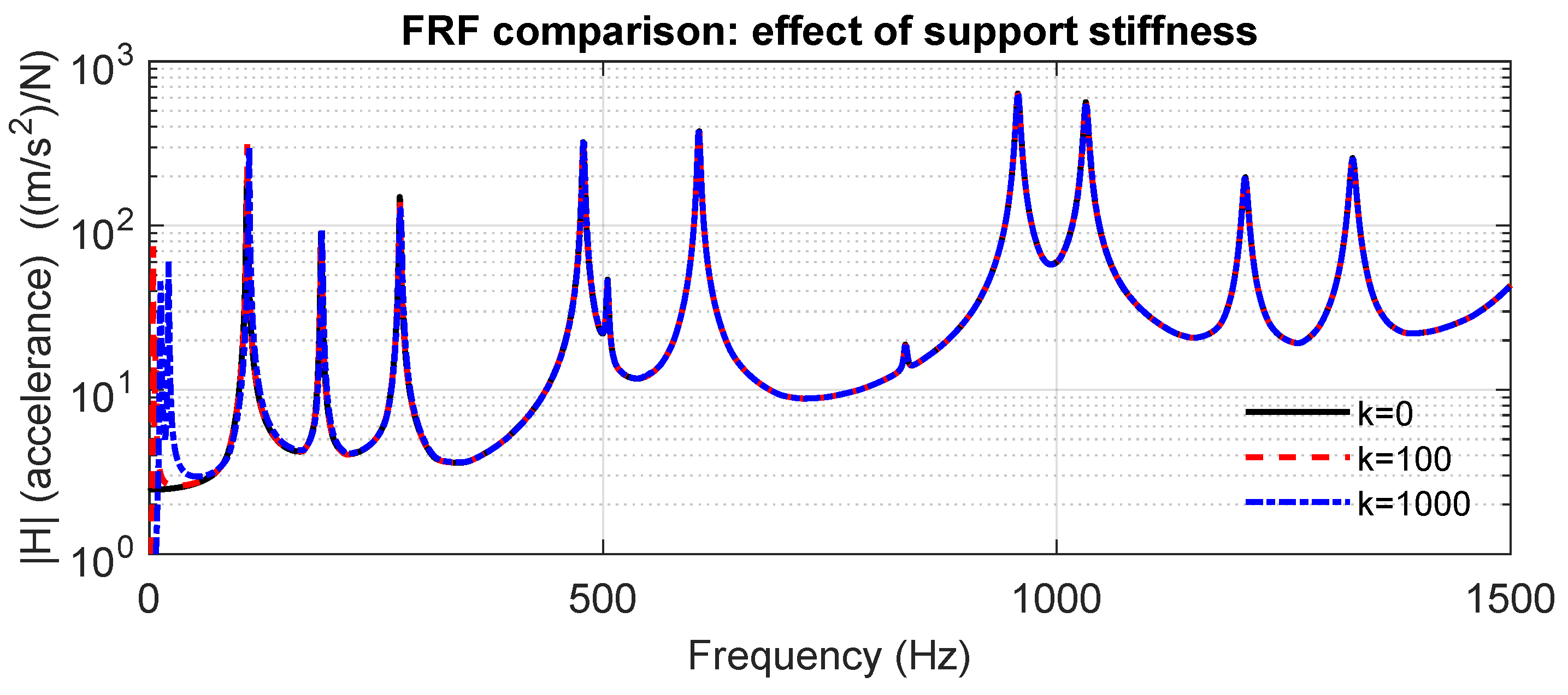 Figure 8) show that the spring stiffness mainly affects the low-frequency range corresponding to rigid-body motions, shifting the first resonance by up to 1–8 Hz. However, for frequencies above 50 Hz, the effect of the boundary elasticity becomes negligible, and the FRF curves collapse for all tested stiffness values. Therefore, the free–free model provides an adequate representation for the frequency ranges analyzed in this study, and no boundary compliance correction is needed in the optimization phase.