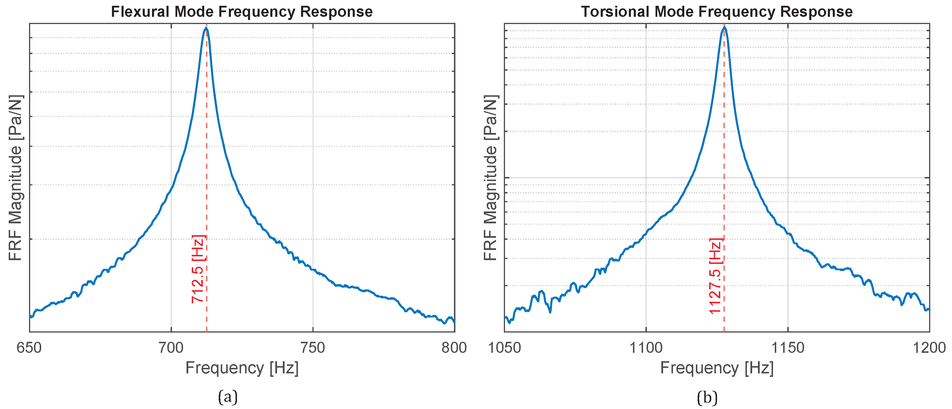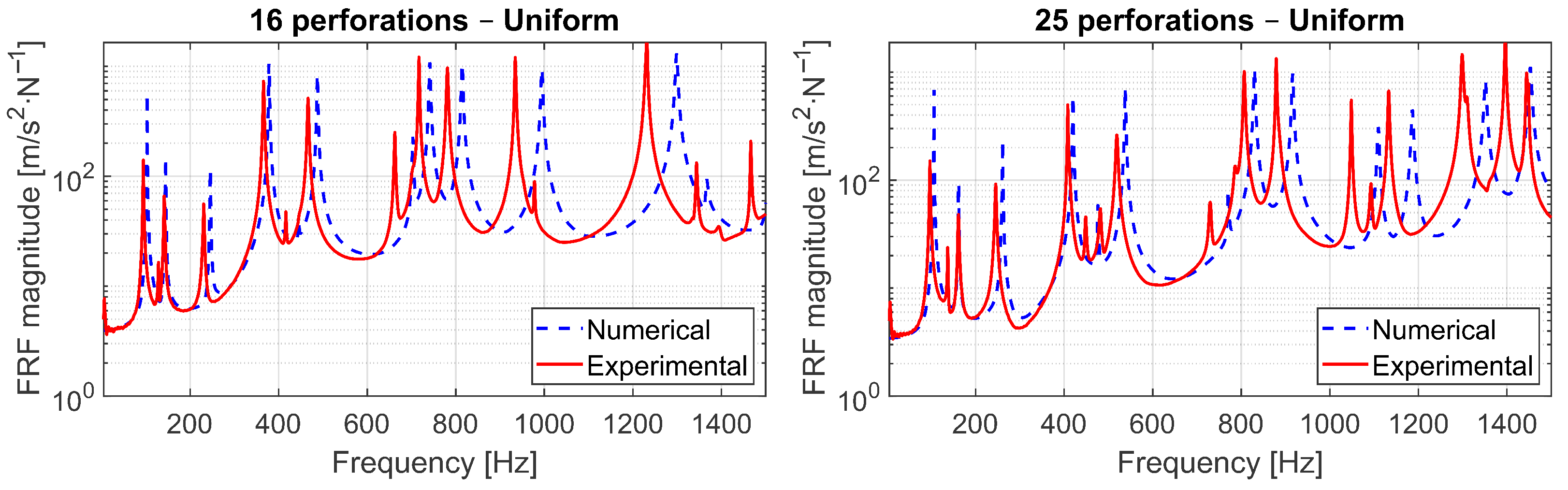 Figure 22). The mesh refinement analysis demonstrated that these discrepancies are not associated with discretization, since the medium and fine meshes yield virtually identical FRFs. Likewise, the boundary compliance study showed that the suspended support condition only affects the rigid-body region below 50 Hz, with negligible influence in the frequency bands of interest. Therefore, the remaining deviations can be primarily attributed to (i) uncertainties in the material properties of the manufactured plate and (ii) the idealizations inherent to the plate formulation (e.g., Reissner–Mindlin kinematics, constant thickness, and perfectly circular perforations). Minor geometric tolerances introduced during machining and small mass loading effects from the accelerometer may further contribute to the observed differences. Despite these factors, the agreement remains strong across the operational frequency bands relevant to the optimization.