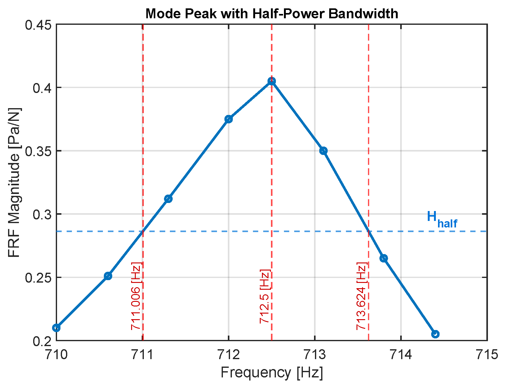 For a given excitation degree of freedom k (impact point) and response degree of freedom i (accelerometer location), the single-input/single-output FRF is evaluated over the target frequency bands. To obtain a robust scalar measure per plate for the optimization objective, the magnitude of the FRFs from all response locations is averaged before computing the root-mean-square (RMS) value in each target frequency band. The FEM outputs were coupled with the PSO optimization loop to evaluate the RMS FRF amplitude over the prescribed frequency bands.