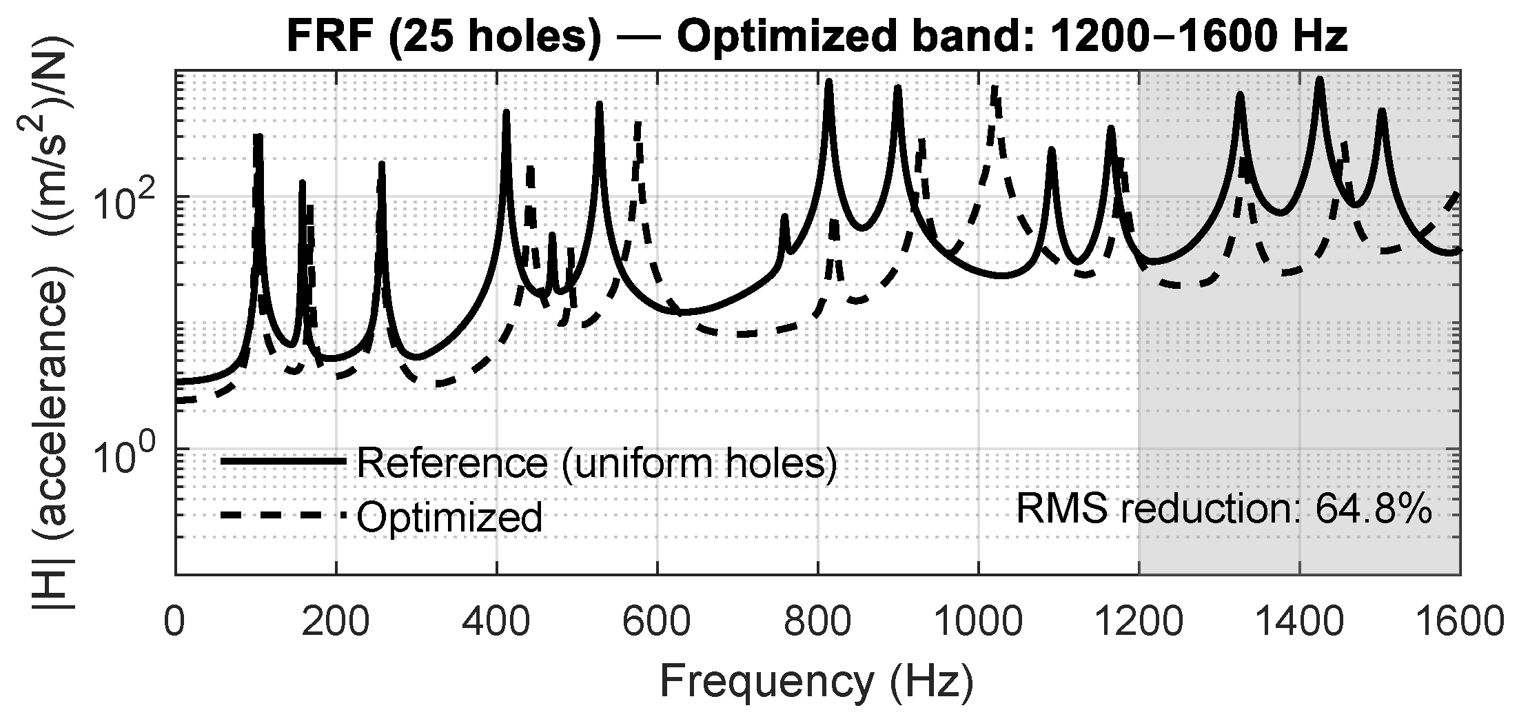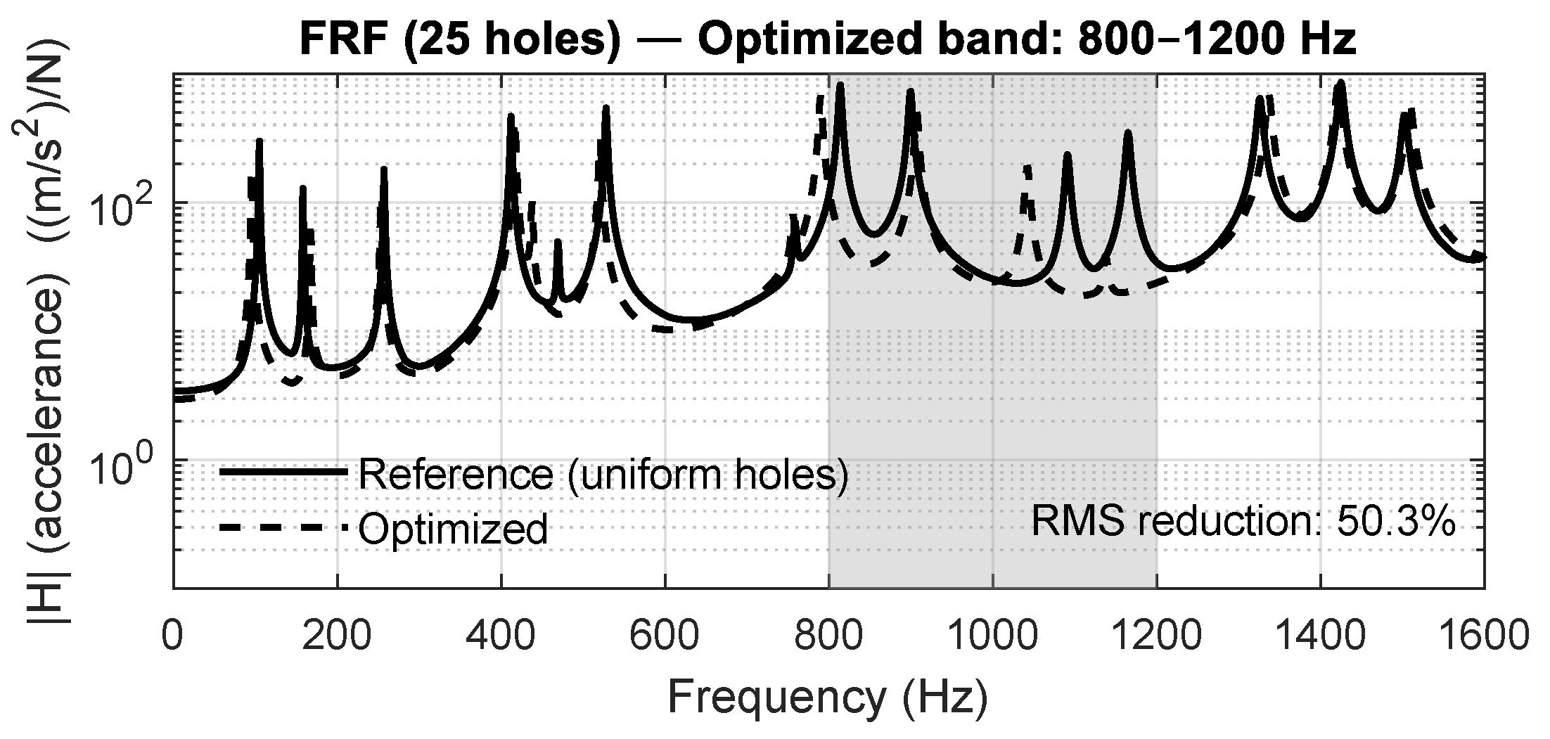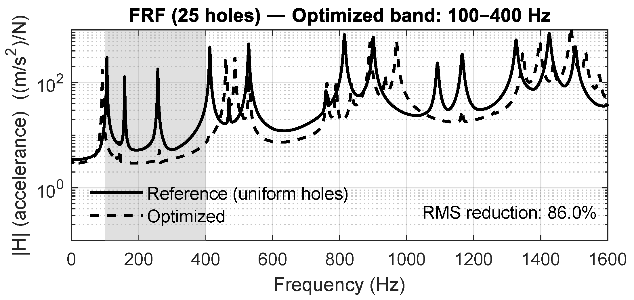 10)]. This objective reduces the average FRF magnitude over the entire target band, yielding frequency-selective attenuation that is robust to narrow spectral features in finite plates.